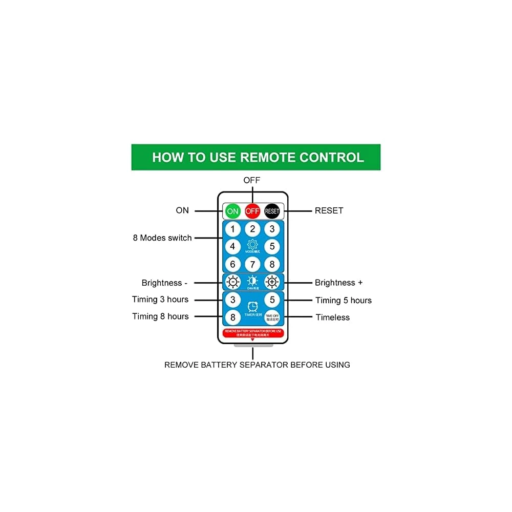 - 【8 Lighting Modes with Remote】Combination, In Waves, Sequential, Slow Glow, Chasing/Flash, Slow fade, Twinkle/Flash, Steady on. You can even control the brightness and set 3/5/8 hours to turn off the net lights outdoor mesh lights regularly. Transfer the modes with remote or press the button on the transformer or the solar panel. (NOTE: The remote only work for the solar modes.)