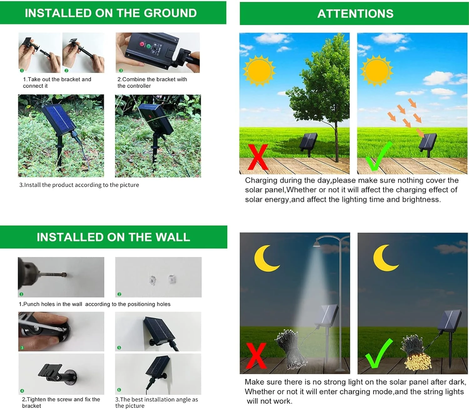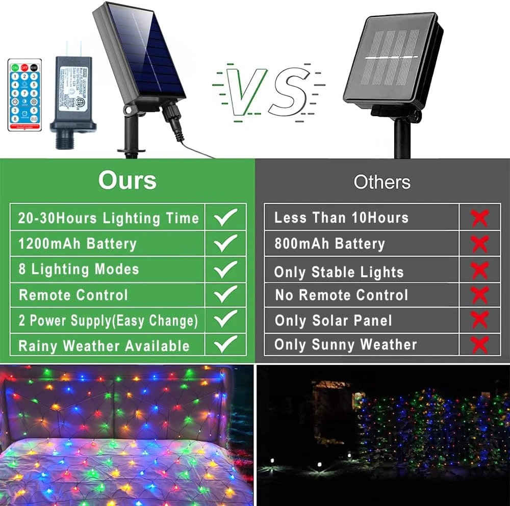 - 【2 power supply Net Lights -Solar & Transformer】 2 power supply ways. Our LED net lights is solar powered, energy-efficient, just put the solar panel under the sun, the battery will be charged by direct sunshine. When it is dark, the net lights will automatically light up. It also come with a transformer to ensure the lights can be used anytime. (especially in cloudy and rainy days)
