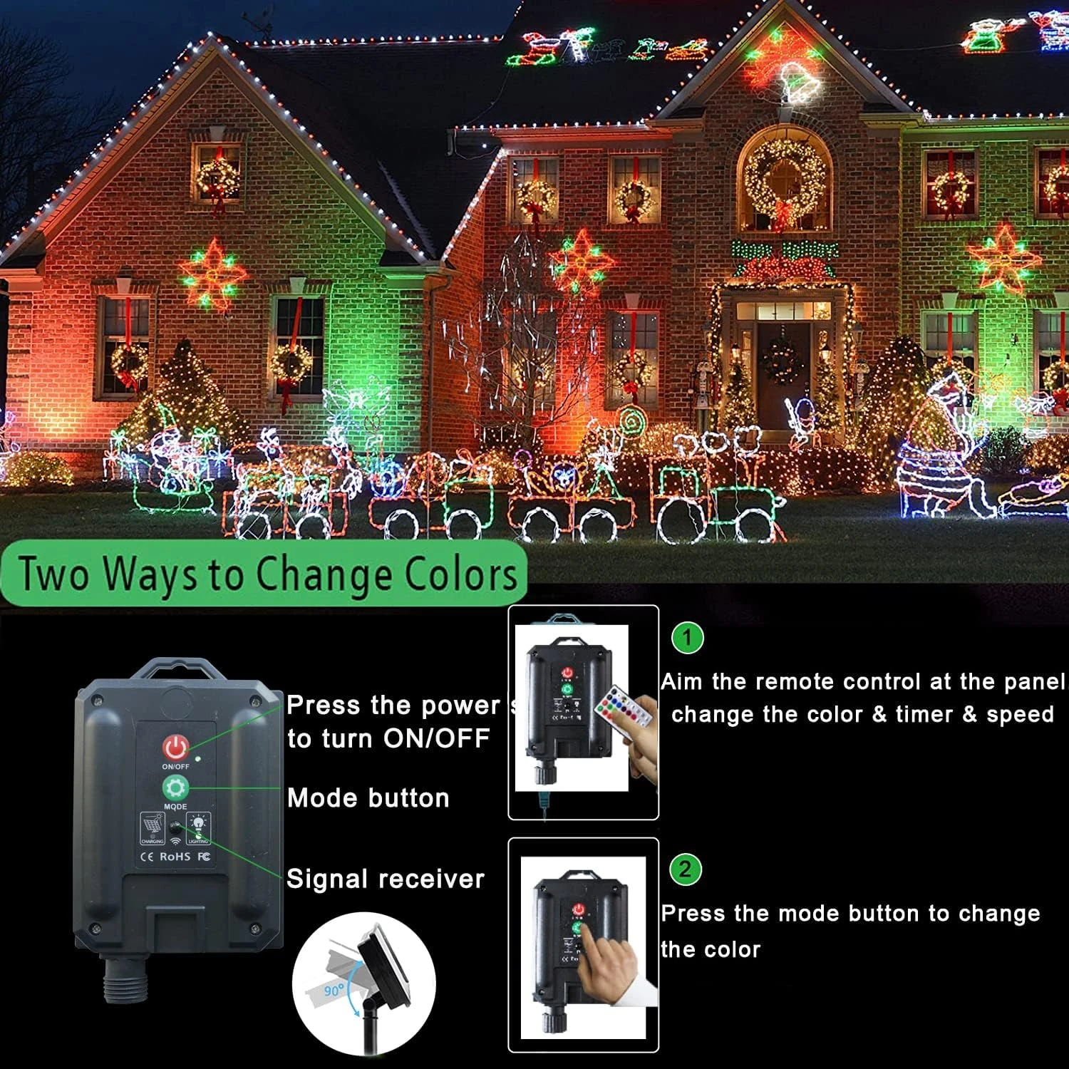 - 7 Lighting Remote Control & Timer: Use the 32 keys remote controller for easily operation.7 lighting modes make the PVC tube fairy string lights fabulous:FADE, JUMP, ASYN FADE, ASYN JUMP, TWINKLE, STROBE, IN WAVES.This decorative solar rope string lights make your house and garden charming and romantic. Timer function : 4H/6H/8H. Freely control the solar Christmas lights, COLOR, MODE and TIMER are all in your control.