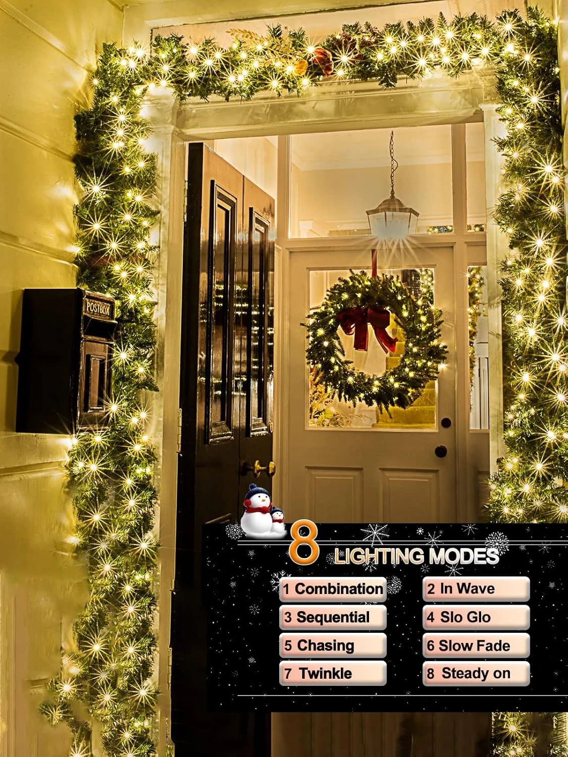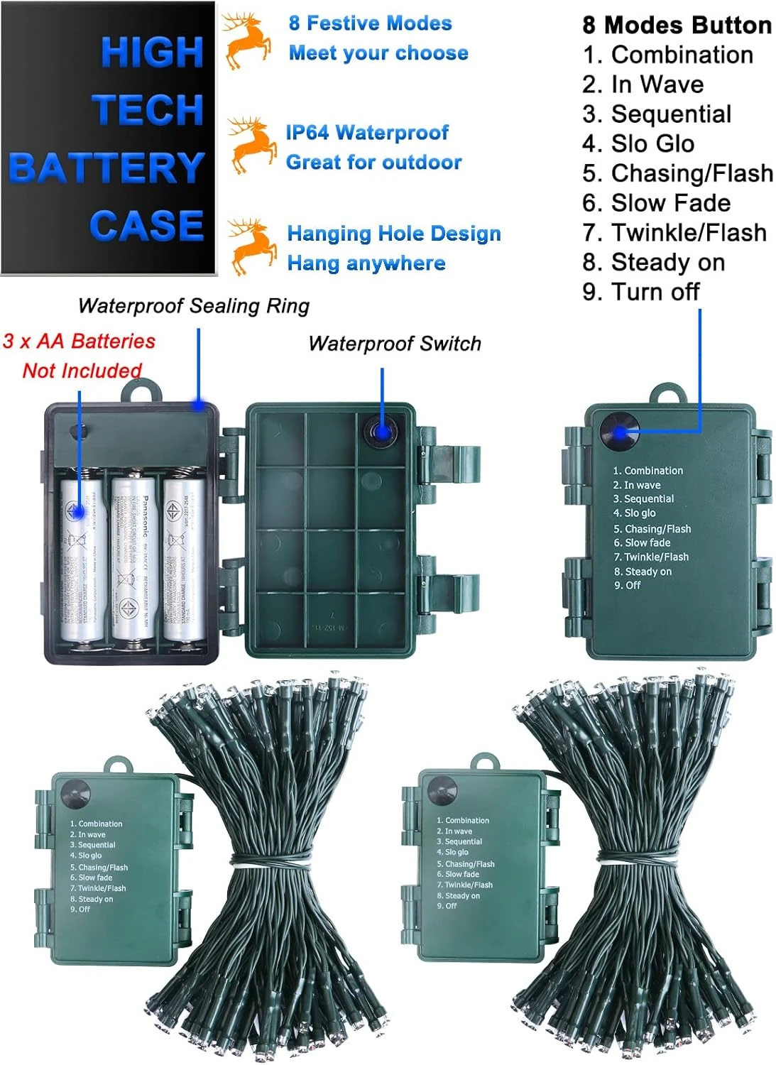 - 【8 Variable Modes Xmas Tree Lights】 8 kinds of bright light modes: Combination, In Wave, Flashing, All Flashing, Chasing/Flash, Slow fade, Twinkle/Flash, Steady on. With just one button for modes switches on the battery box, you could enjoy beautiful garland lights. The dark green cable can easily hide at night and in the green plants, more charming. Note: No remote control included.