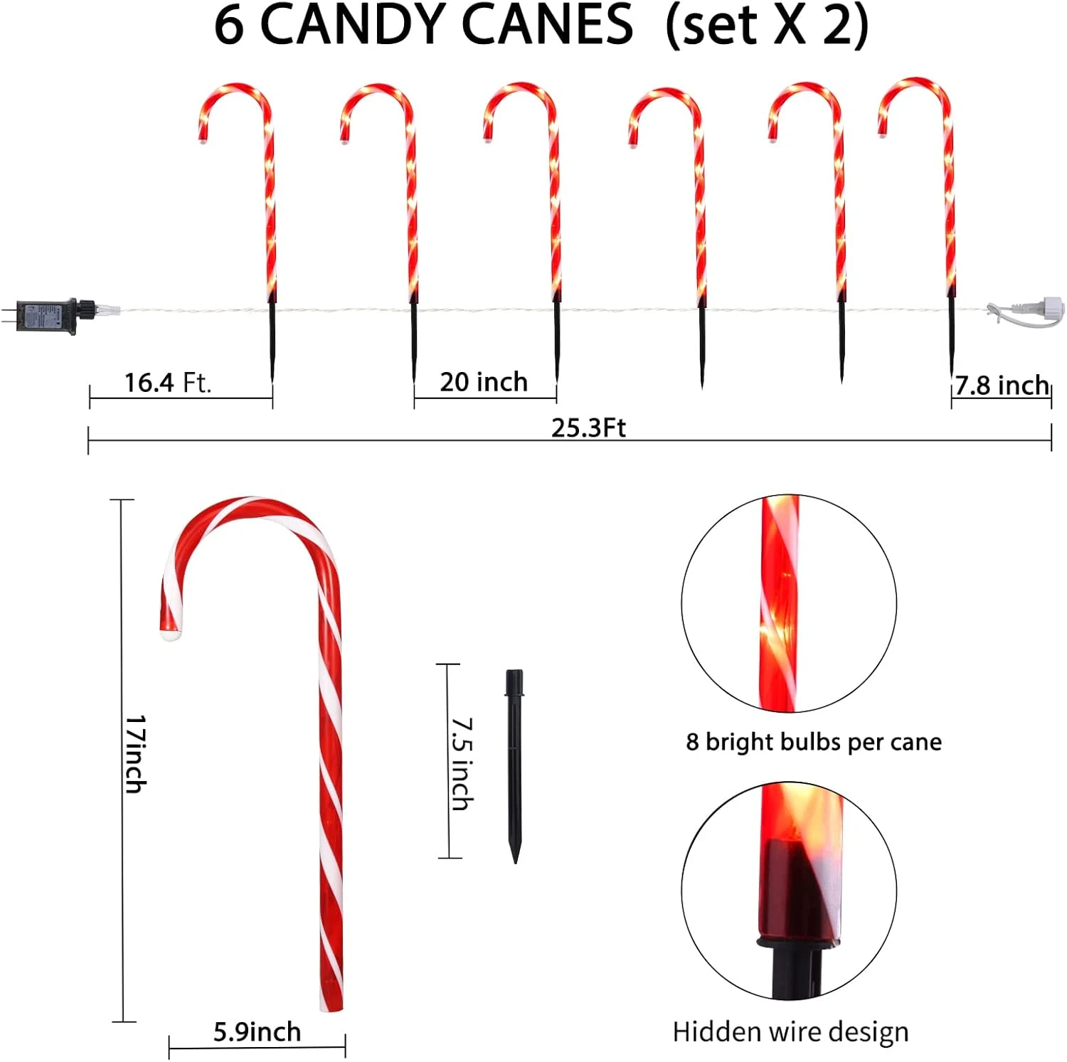 - Upgraded Candy Canes: Each 24.5 inches (include stake) height candy canes with 8 high quality clear bulbs. Each set contains 6 candy cane that are 20 inches apart and 25.3 feet in total length. Connect up to 3 sets end to end. You can get 2 sets of 6 Christmas decoration lights and make it a perfect choice for driveway markers