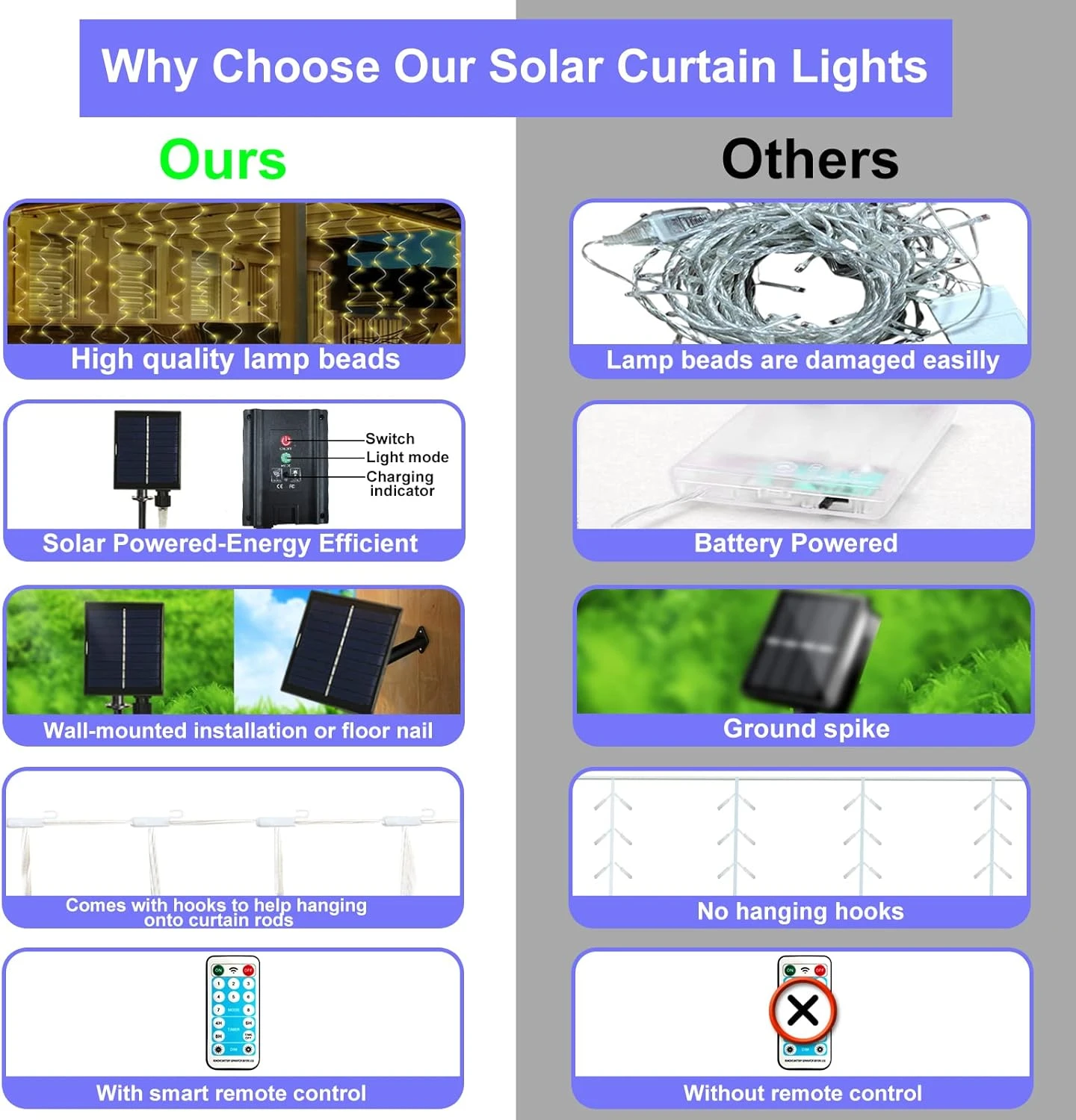 - 【Energy Saving LED & Durable Wire】Our solar curtain light made with high quality copper , resistant to weather changes and use solar energy and are less expensive to run, enabling you to save over the long term. Compared with traditional Christmas lights, it can save energy by 90%. Economical and Durable!