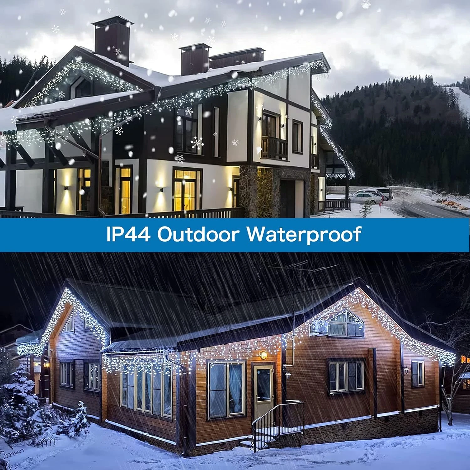 - 🏡 SAFE TO USE: Our icicle string lights has approved UL Certification, energy saving, low power consumption, you can ensure that the touch is cool and does not overheat while ensuring the brightness of the light source. Allows you and your family to safely enjoy the fun of lighting. Waterproof icicle christmas lights prefect for indoor and outdoor decoration, but the plug are not, should be used with waterproof receptacle cover when used outdoor!
