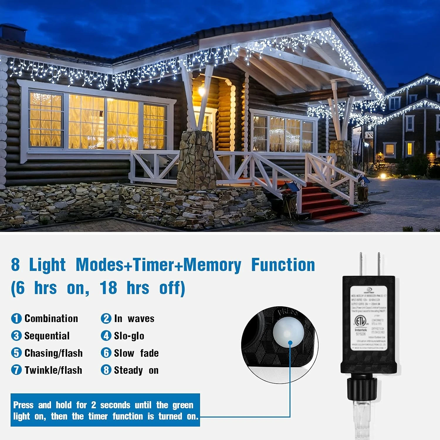 - 🎄 8 LIGHTING MODES & TIMER: The led icicle string lights come with 8 modes: combination, in waves, sequential, slogs, chasing/flash, slow fade, twinkle/flash, and steady on. Press and hold the button on the transformer for 2 seconds to enable timer, operating Time 6 hours(6 hours power on and 18 hours off daily cycle auto on/off). The memory function design will remember the last mode setting after cutting off the power, no need to reset the decorative lights next time.