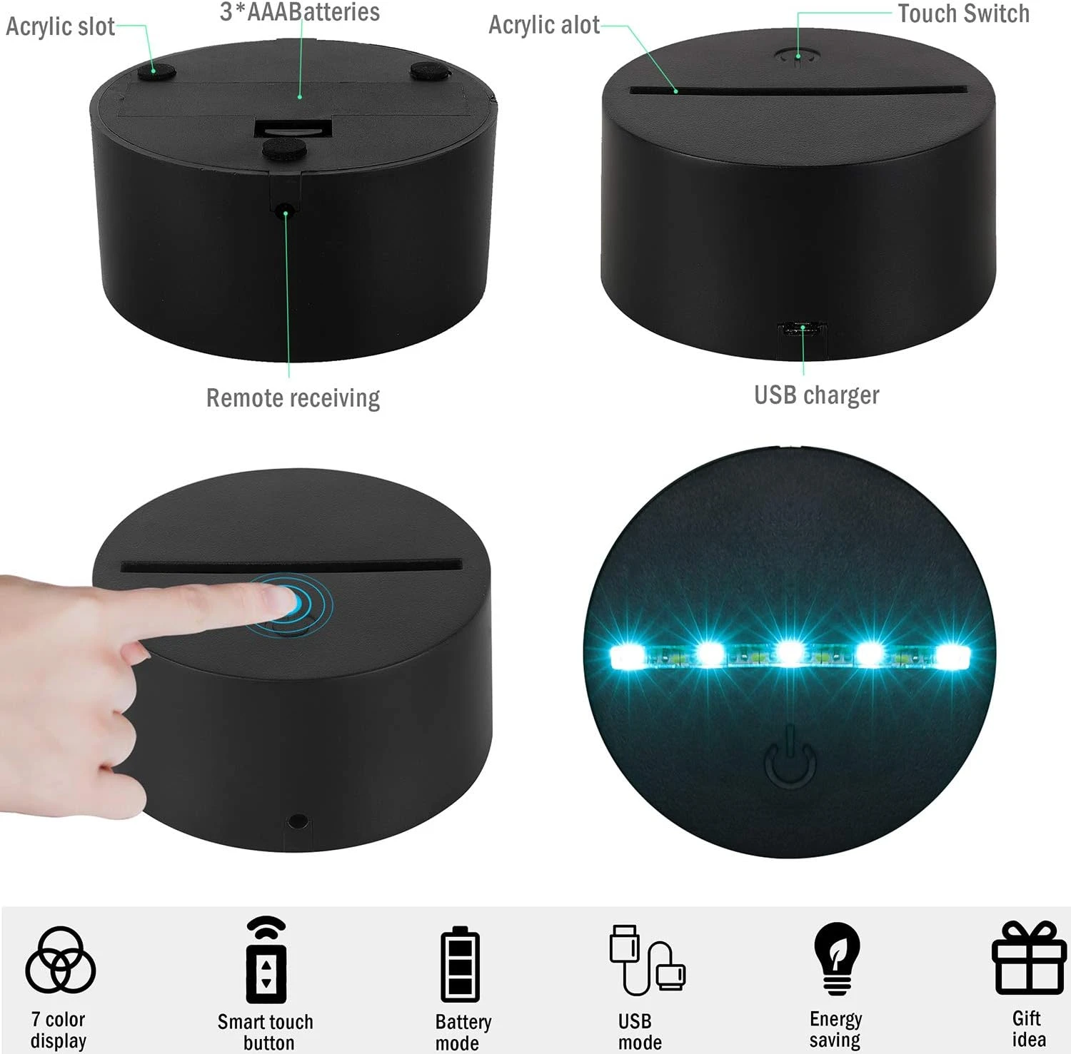- Smart Touch Sensor – 7 colors LED 3D night light, including white, red, green, blue, yellow, cyan and purple by touch power button on ABS base. you can turn on/off this product just by touching the power button. Choose your favorate color.