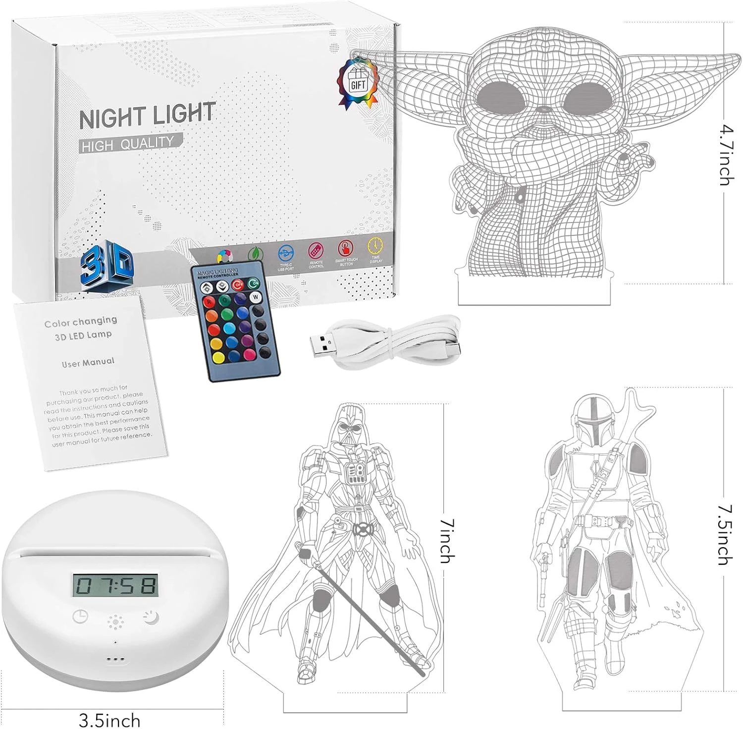 - Star Wars Night Light: 3 Acrylic Plate(Darth Vader, Grogu and The Mandalorian), 1 ABS Night Lights Base, 1 Remote Control, 1 USB Cable and a User manual