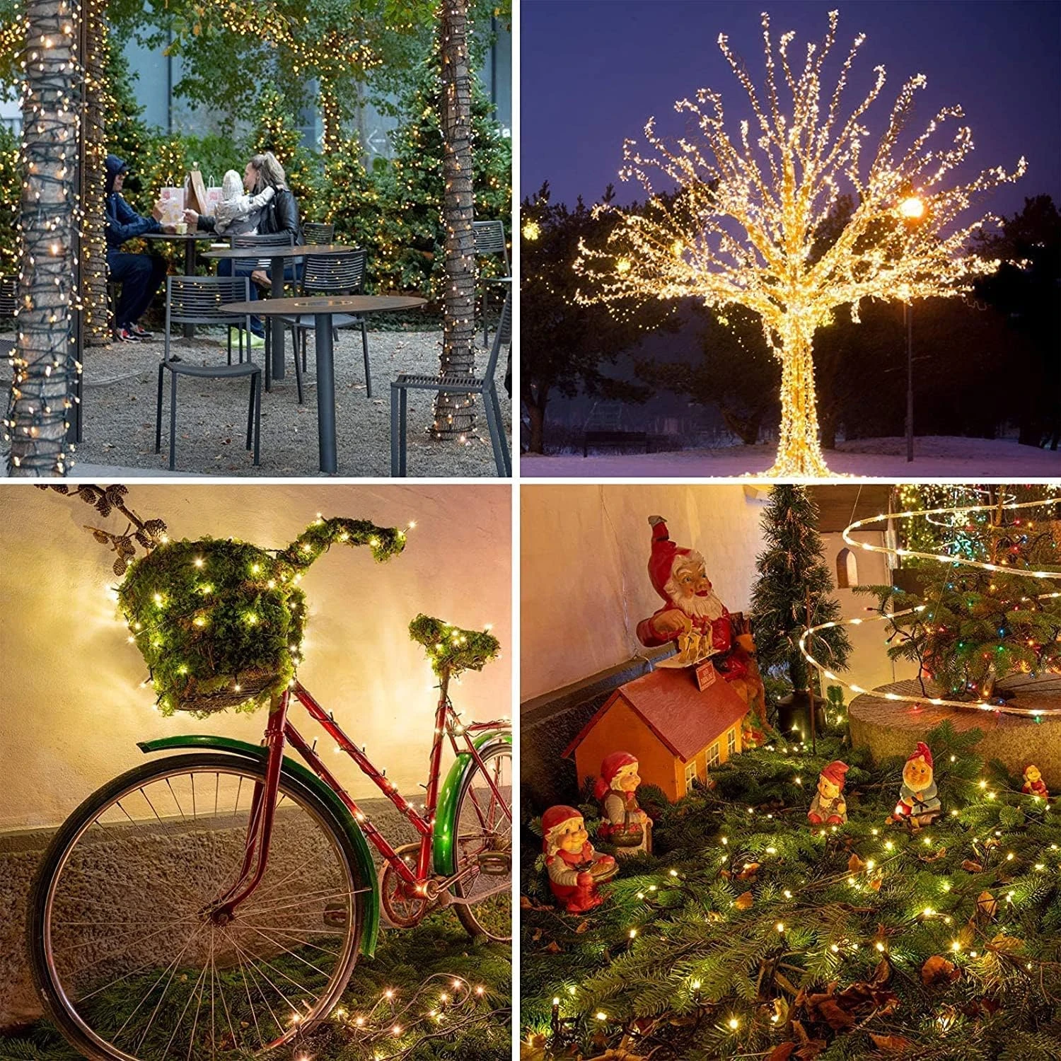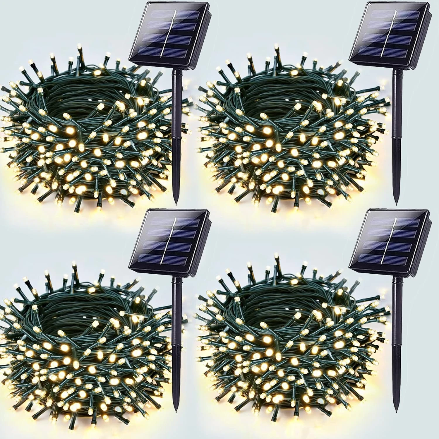 - 【2023 New Upgraded Solar Outdoor Lights with 8 Lighting Modes】: Extra-Long (4-Pack Total 180FT & 320 LED), Unique 8 Lighting Modes & Memory Function & Auto On/Off, Higher Solar Powered Conversion with Larger Size Solar Panel, Larger Capacity Built-in Battery, IP65 Waterproof Performance.