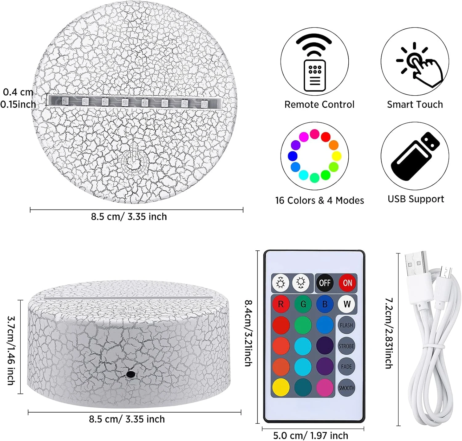 - Proper size: the size of the lamp base is about 8.5 x 8.5 x 3.7 cm/ 3.35 x 1.46 x 1.46 inches; You will receive 4 pieces lamp bases, and per pack includes 1 piece lamp base, 1 piece remote control and 1 piece USB cable