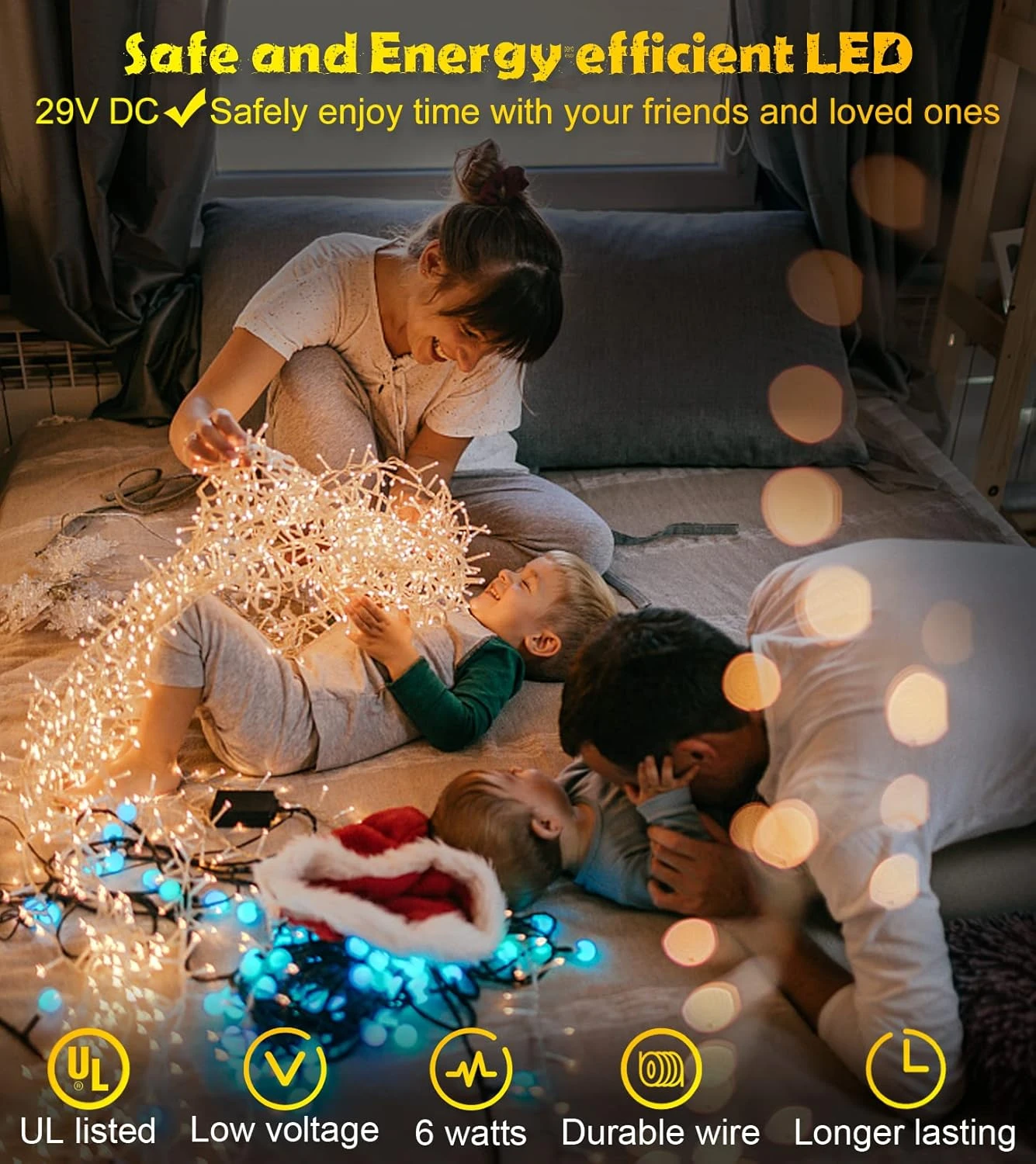 - 👍【Safer and Energy Efficient】High Efficient LED lights will save you money on energy costs, they’ll last longer than incandescent lights and you don’t have to worry about them overheating. Features upgraded 29v low voltage adapter string lights supporting up to 438ft extra long & 1200 LED in one strands , so you’ll cover a greater area with one strands and only one adapter.