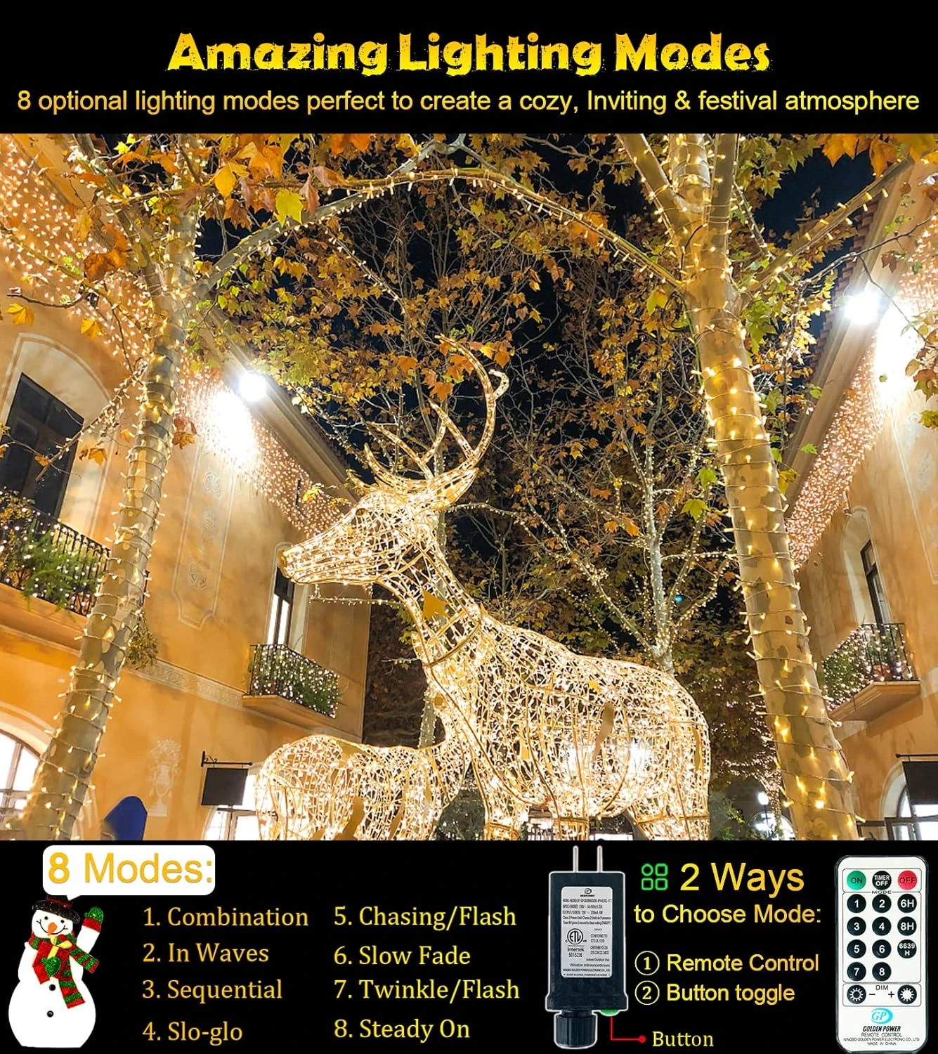- 2022 Upgraded Christmas Lights✔– These top-rated LED string lights are 426.5ft long, lead wires are 11.5ft long, and they feature 1200 quality crystal clear led lights. Features upgraded 29v low voltage adapter string lights supporting up to 438ft extra long & 1200 LED in one strands , so you’ll cover a greater area with one strands and only one adapter.
