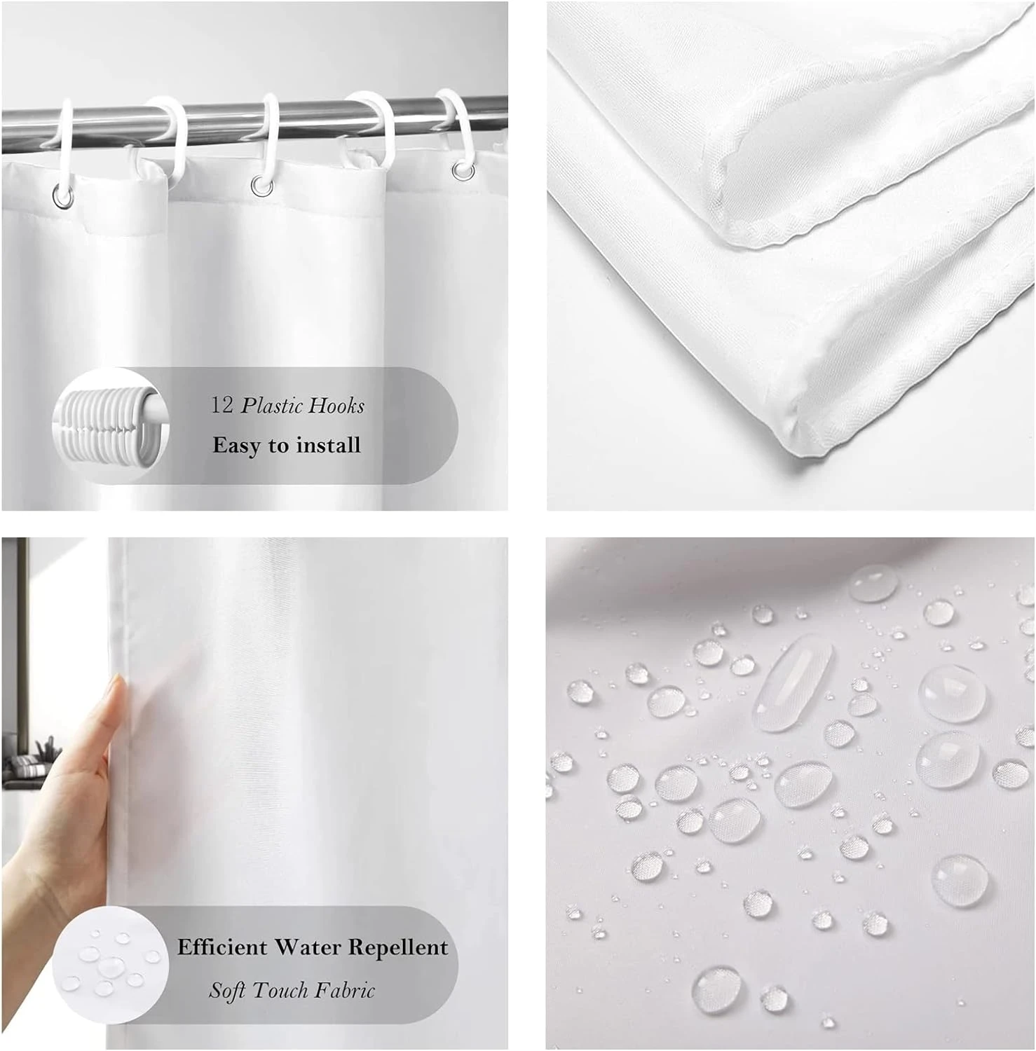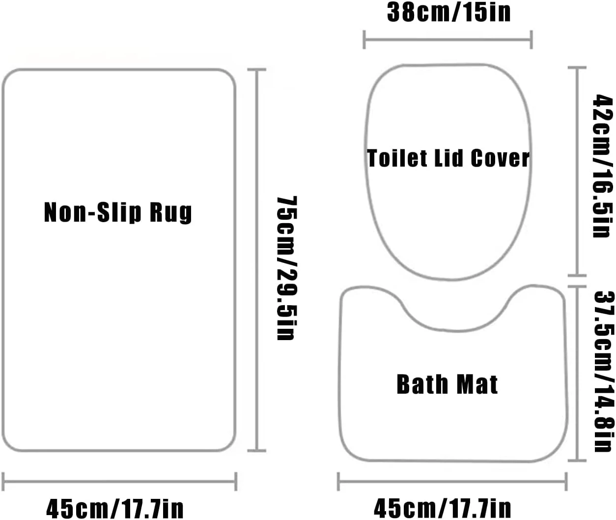 - Size &Package content:You will get shower curtain(with 12 hooks),rug,bath mat,toilet lid cover.shower curtain size:72 x 72 in,rug:17.7 x 29.5 in,bath mat:14.8 x 17.7 in,toilet lid cover:15 x 16.5 in.
