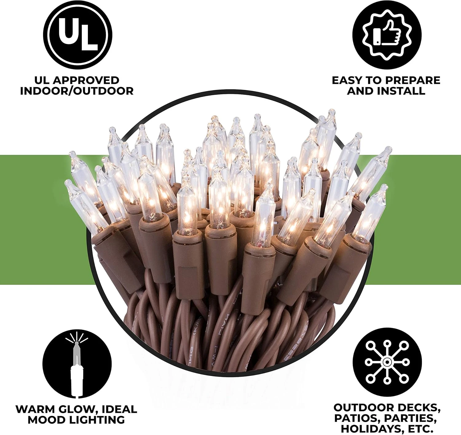- 100 Clear Lights on a brown cord, UL Approved for indoor and outdoor use