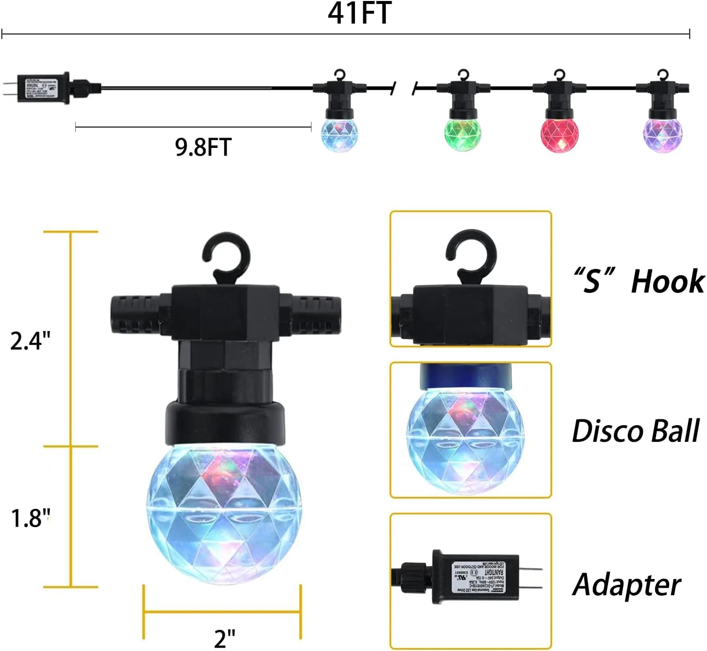 - 【41FT & 15 Disco Bulbs】These Disco Ball String Lights are 41 feet long with 15 disco globe-shaped light bulbs, spaced 19.3inch from each other. The color-changing string lights RGB and powered by electricity are safe to touch, easy to carry, and suitable to use inside and outside; add color to any decor