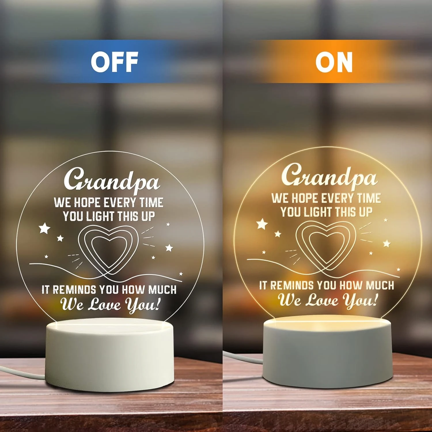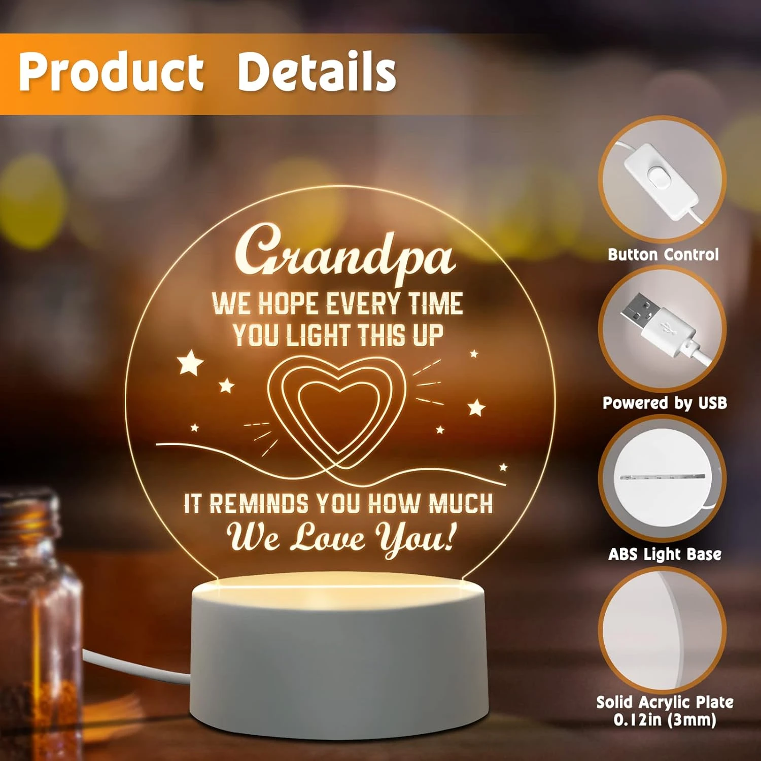 - 【BEST GRANDPA GIFT FROM GRANDKIDS】-The personalized night light with warm words to remind you grandpa “we love you”. This grandpa gift will touch his heart and provoke the deepest emotions, to tell your grandpa how much you love him. This is a unique grandpa gift you will be proud to give and a present he will cherish it forever.