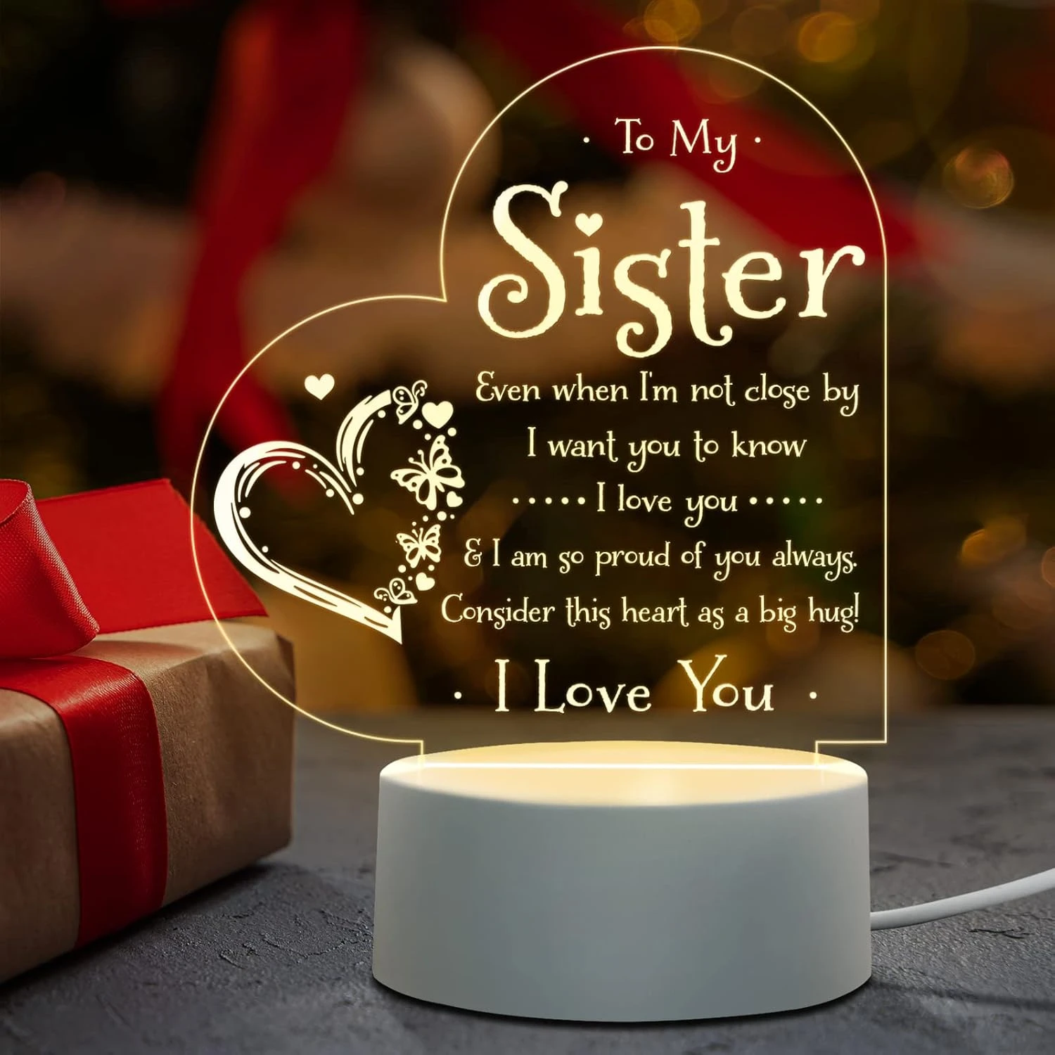 - Unique Gifts for Sister: This heart-shaped night light is engraved with beautiful butterfly patterns and touching words – “even when I’m not close by, I want you to know I love you and I am so proud of you always…” A perfect long-distance sister gift from a sister or brother, to express your love to your sweet sisters.