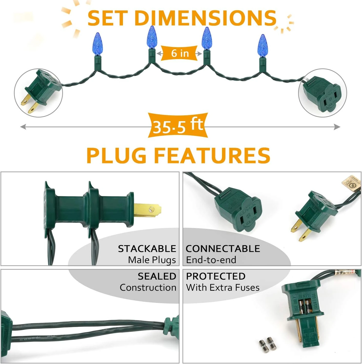 - 💡 C6 Blue Christmas Lights: 70 Counts 35.5ft blue string lights with green wire, 6″ spacing, 6.3″ lead with a stackable male plug, 6.7″ tail with a female plug for easy end-to-end connection.
