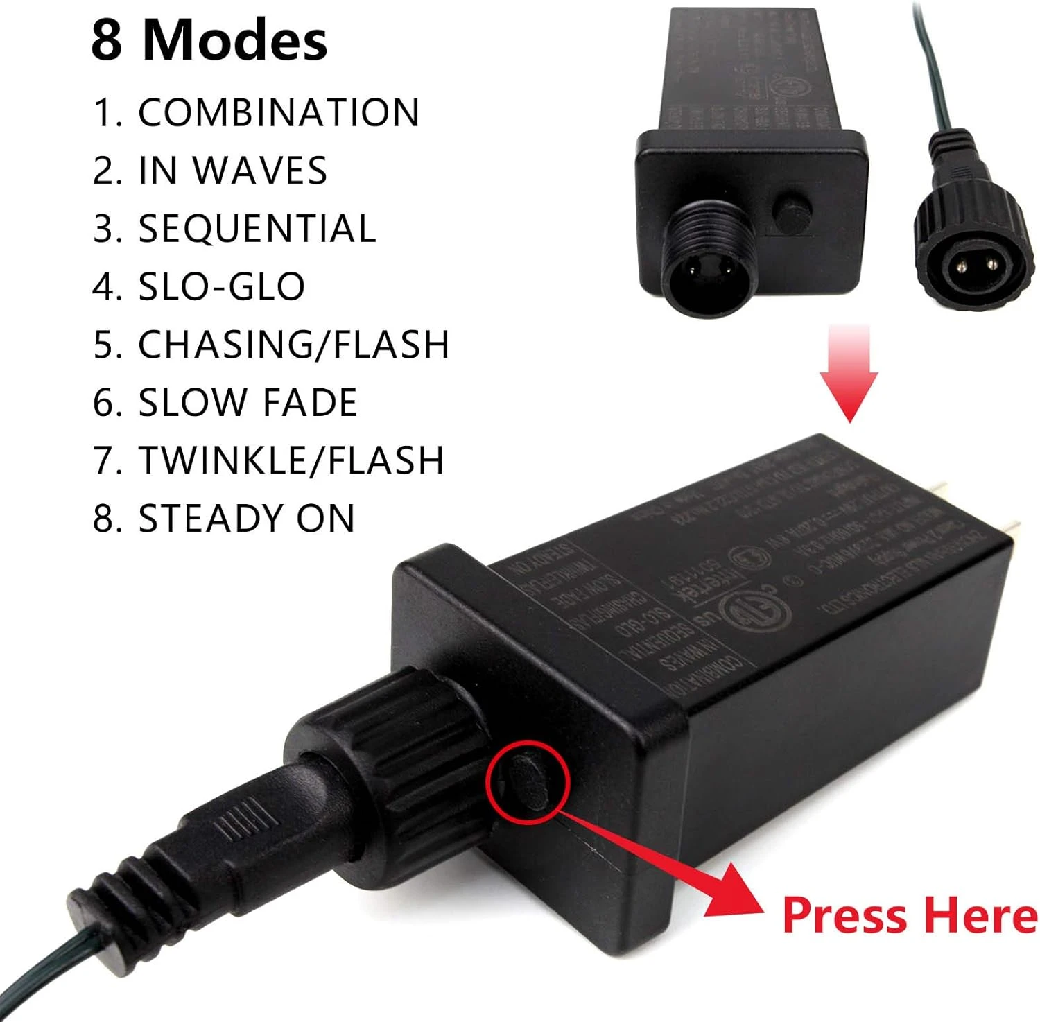 - 【8 Lighting Modes & Memory Function & Timer】: This twinkle lights have 8 modes to fit different occasions, moods, feelings, holidays, festivals, anniversaries, etc. (Combination, In waves, Sequential, Slow Glow, Chasing/Flash, Slow fade, Twinkle/Flash, Steady on). Adjust the lighting modes by pressing the round button on the adapter.