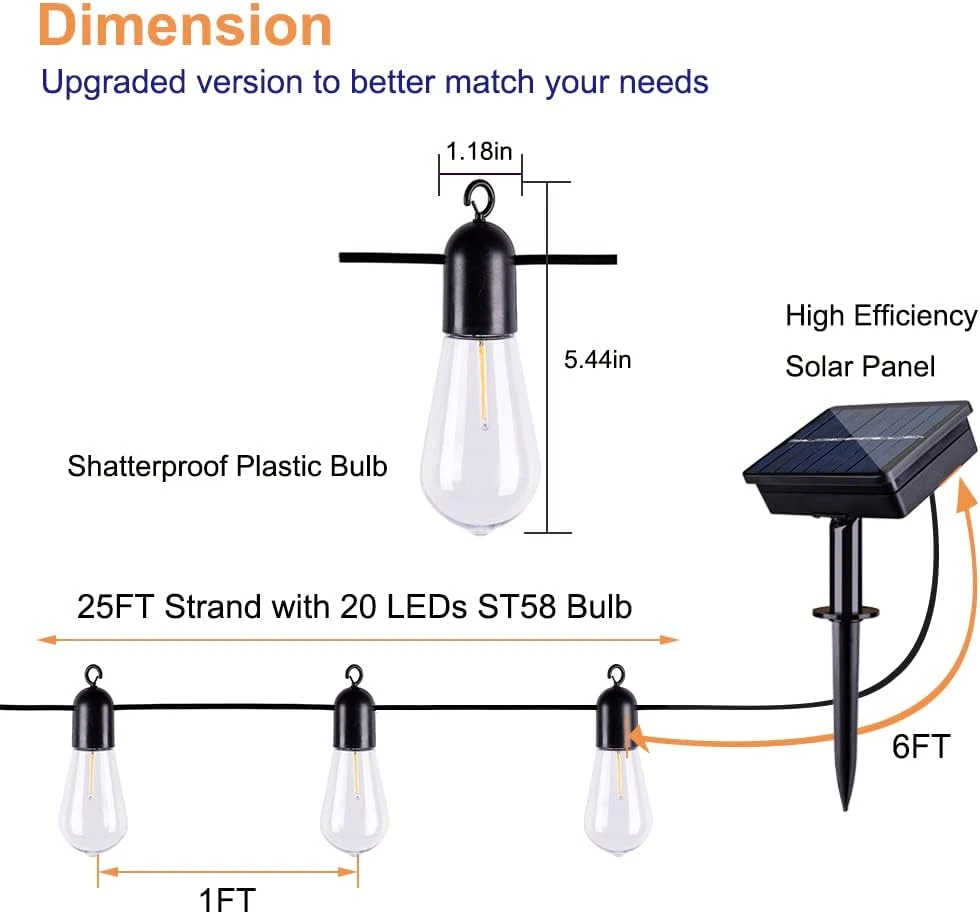 - 【All Weather Resistant & Heavy Duty】IP55-rated solar power string lights outdoor withstand up to 50MPH winds, rain, snow and extreme weather. The thick, flexible cords and durable plastic bulbs are built to last. Perfect for patios, yards, gardens, parties, camping, and more! NOTE: The led solar string lights cannot be linked together. Each solar panel powers one string light.