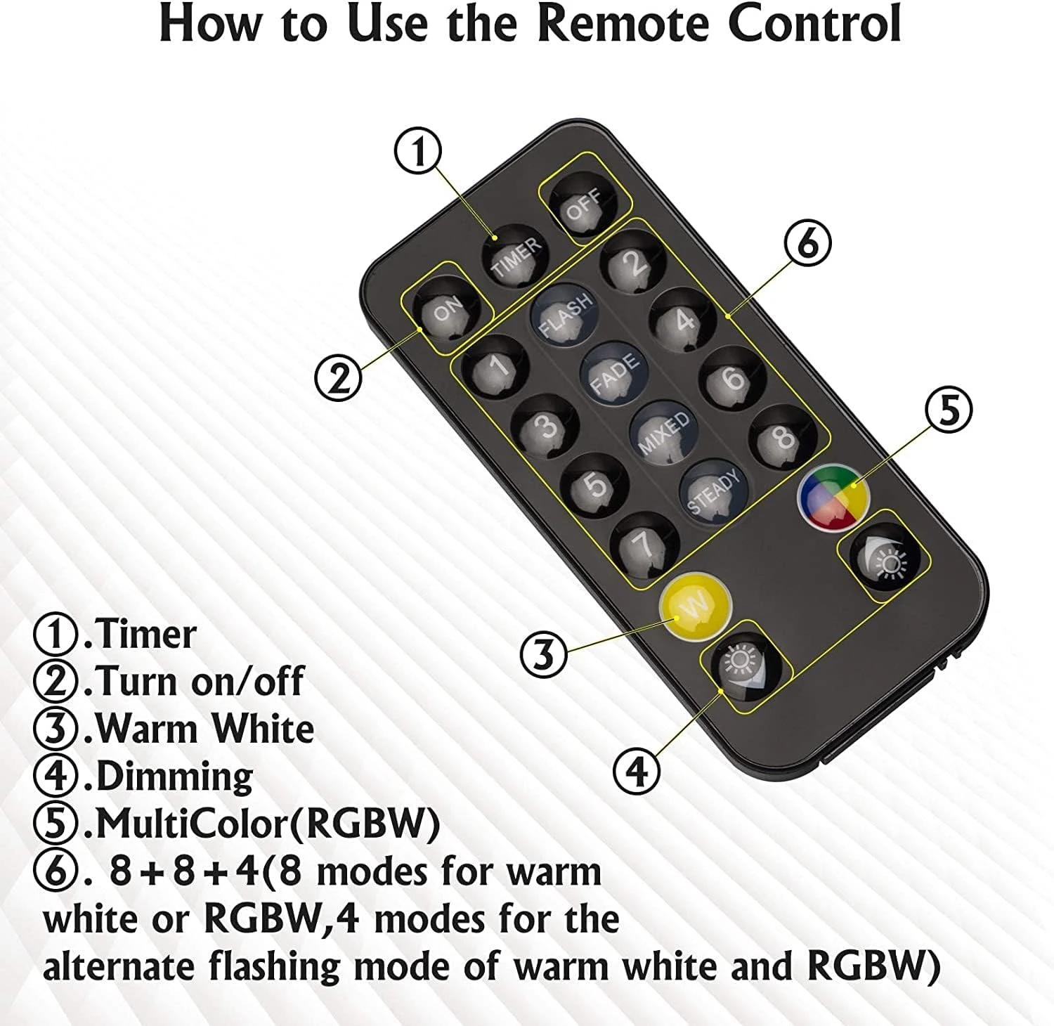 - 【Remote Control with Timer】Use the remote to vitalize the illumination. Point the remote at the string lights, turn on the lights, pick up your favorite color. Each color comes in 8 modes and fixed 2 colors 4 modes. You can choose different lighting modes to match different moods, set timer(4H/6H/8H/24H) to save energy.
