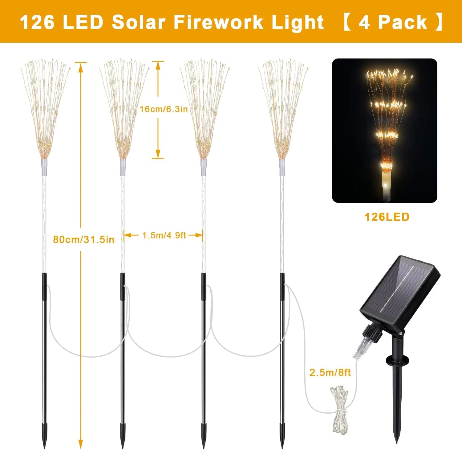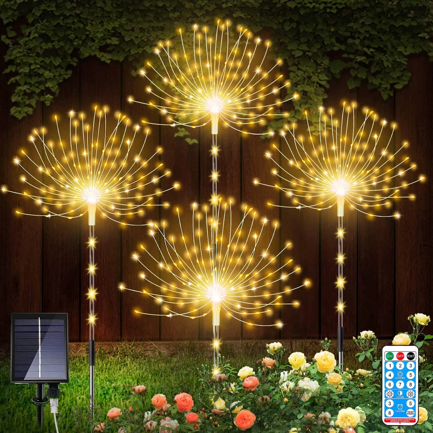 - Multifunctional Remote Control: The solar firework light is designed with 8 light modes, including blinking, strobe and steady modes. You can adjust the light mode, brightness and working time of the LED strip through the remote control. Warm white firework lights are reassuring and warm at night, perfect for creating atmosphere for birthday parties, anniversaries, Christmas.