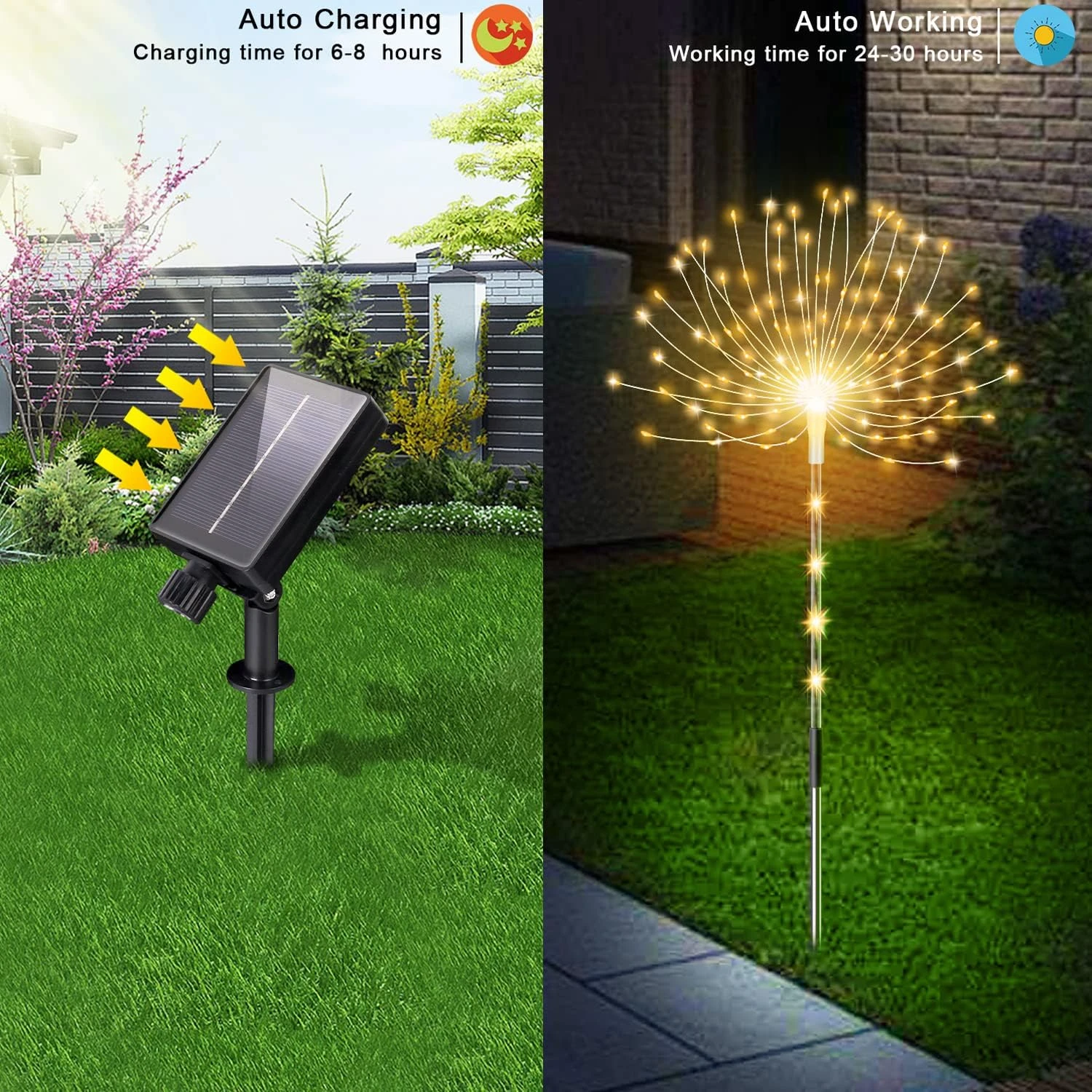 - Continuous Lighting For 24-30h: The solar firework light is equipped with upgraded solar panels and 1200mAh large capacity battery. Compared with traditional firework lights, the detachable solar panel can be placed anywhere in direct sunlight, and the charging efficiency is increased by 20%.Turn on the switch of the solar panel, which can provide up to 24 hours of lighting time when fully charged