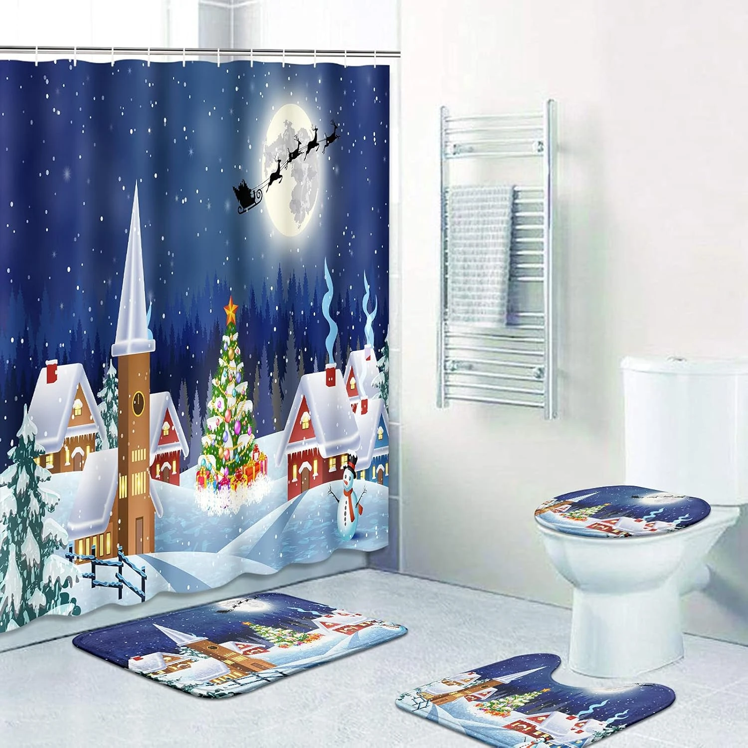 - [Effortless Installation]: Our bathroom set comes with 12 complimentary, sturdy hooks, making installation a breeze. The shower curtain features 12 reinforced grommets for easy hanging, while the non-slip bath mat and toilet lid cover ensure safety and comfort.