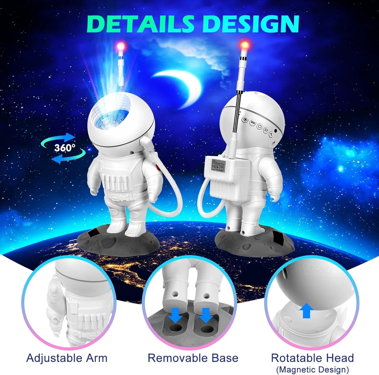 - ✨【Projection Angle Adjustable】:The starry night light projector is designed 10 space scenarios, which can be adjusted according to your mood slides. the astronaut’s head is magnetically connected to the body for easy adjustment of the nebula to any place without restriction. Also, the moon base is detachable, the arms can also pose, and you can insert a flag.which makes it not only a astronaut light star projector but also a good-looking decorative ornament.