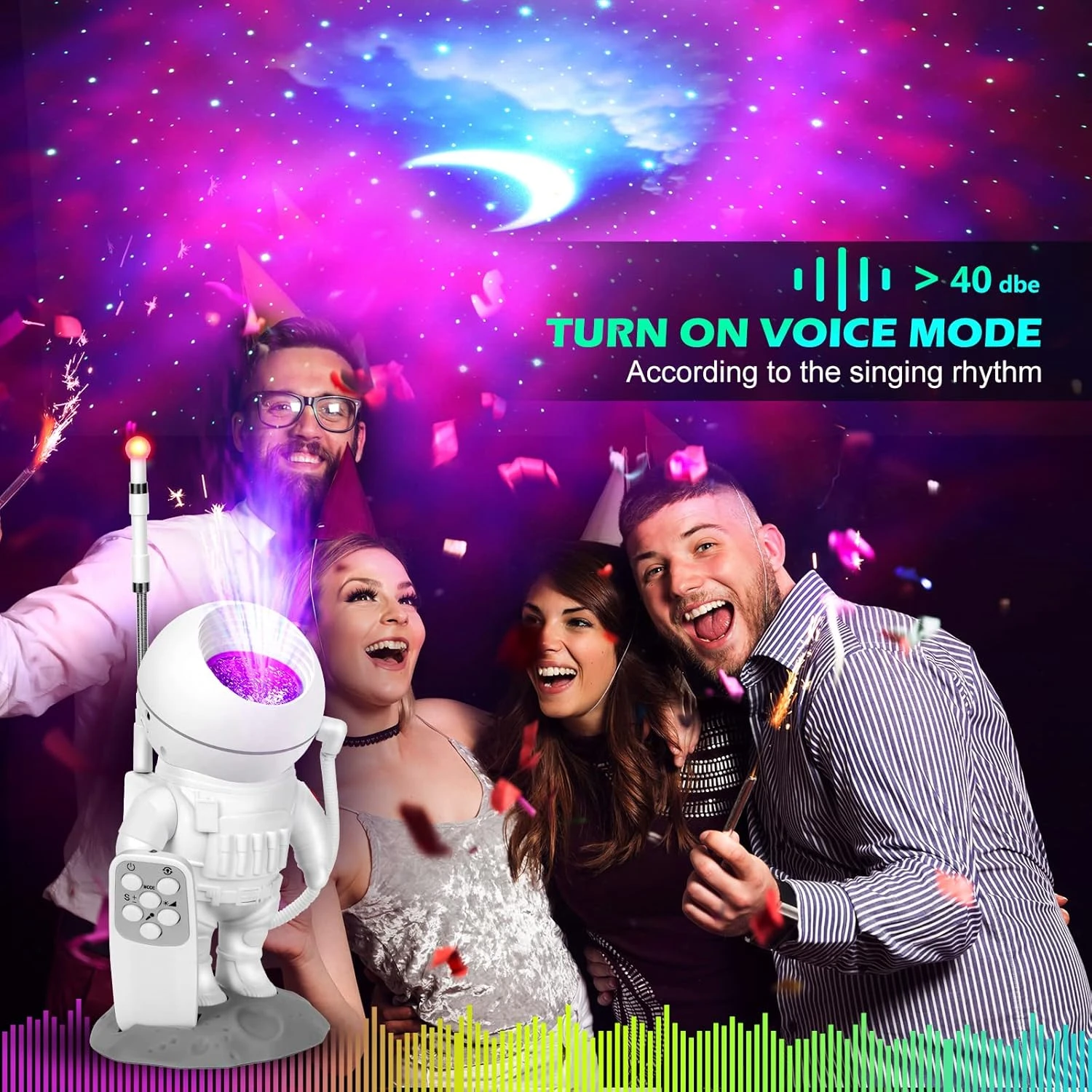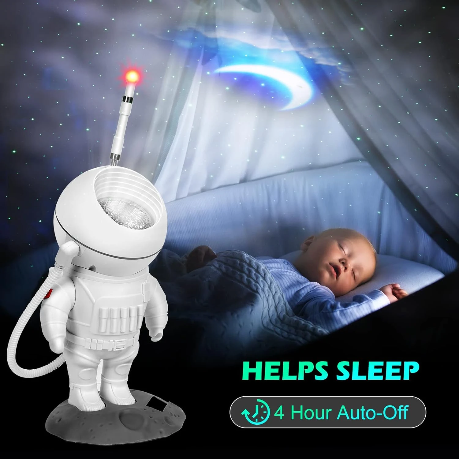 - ✨【Astronaut 4 in 1 Star light Projector】:This galaxy light projector features 10 stunning nebula and Gypsophila and moon effect, The three of them can be adjusted freely and displayed together. Project it onto the wall or ceiling of your room and it will make you feel like in the vast galaxy, creating a romantic and relaxing atmosphere. the galaxy projector have voice control mode will constantly flash in sync with the rhythm of music you play.