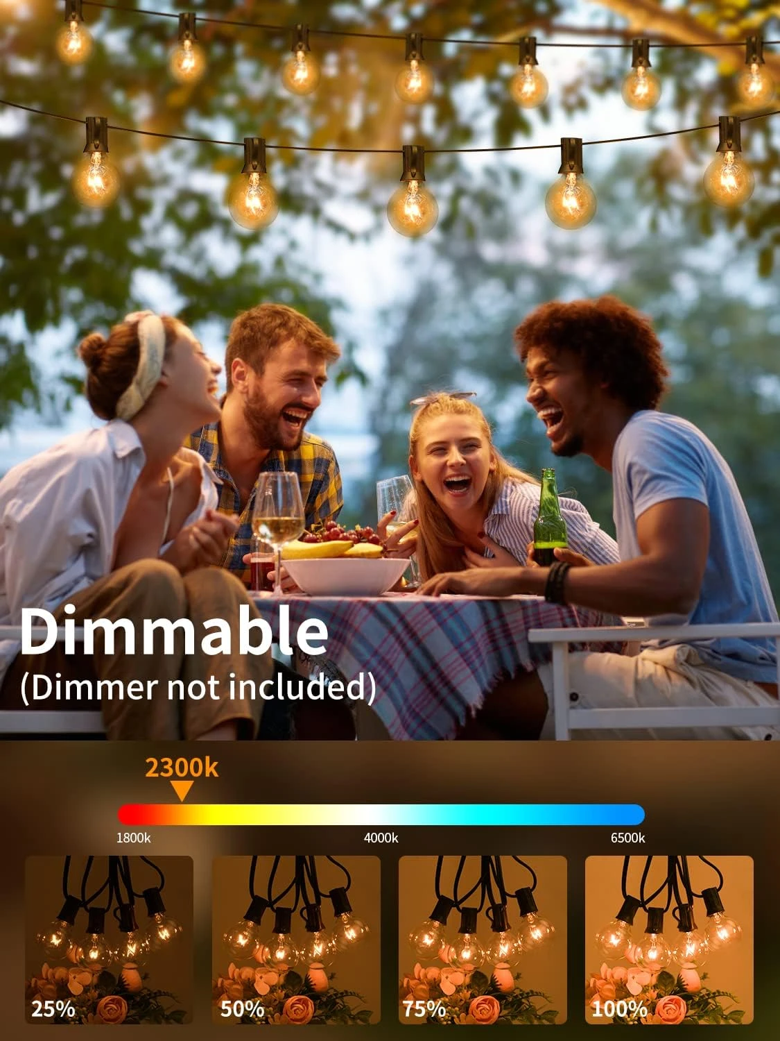 - 【UL Listed & Dimmer Compatible】Our patio lights string are UL listed for safe use. Their adapters and cords are certificated, and short circuit protection is supported. These string lights outdoor waterproof are dimmable, you can customize or change the atmosphere as you want by changing the brightness of the string lights. (Note: DIMMER NOT INCLUDED).