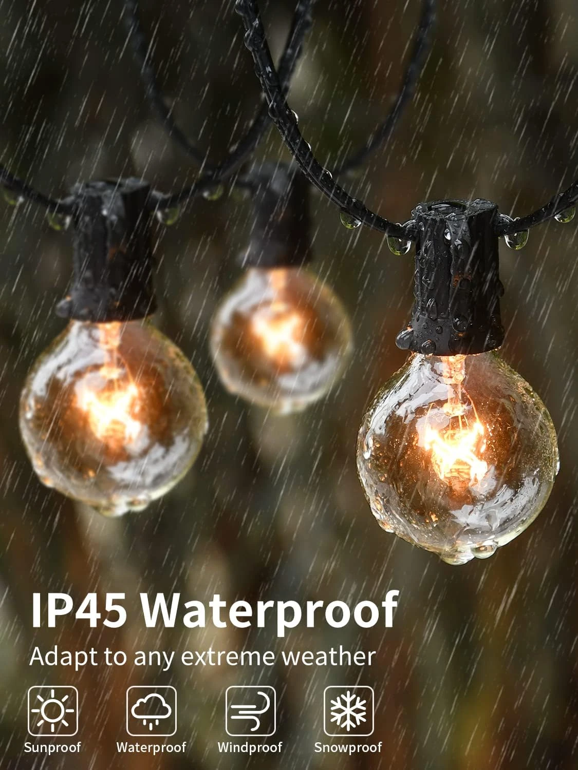 - 【Weatherproof String Lights】IP45 waterproof string lights for outside, fully sealed and waterproof design socket, not affected by sunlight, rain, snow and wind. When used outdoors, it can better deal with extreme weather, the best choice for outdoor lighting. 2 spare bulbs for replacement. All the remaining bulbs will continue lighting up and brightening up our lives even if some bulbs are broken or removed.