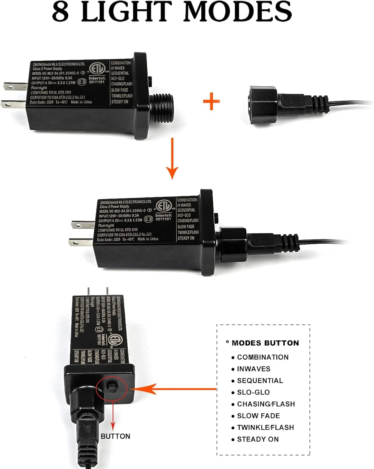 - 【UL CERTIFIED Plug in string light 】: This string light is equipped with a UL CERTIFIED transformer, which makes the whole light is very low energy consumption. The transformer comes with 7 flash modes and steady on mode, the switch button is on the tail of the transformer. Waterproof(IP44) Perfect for indoor and outdoor decorations.
