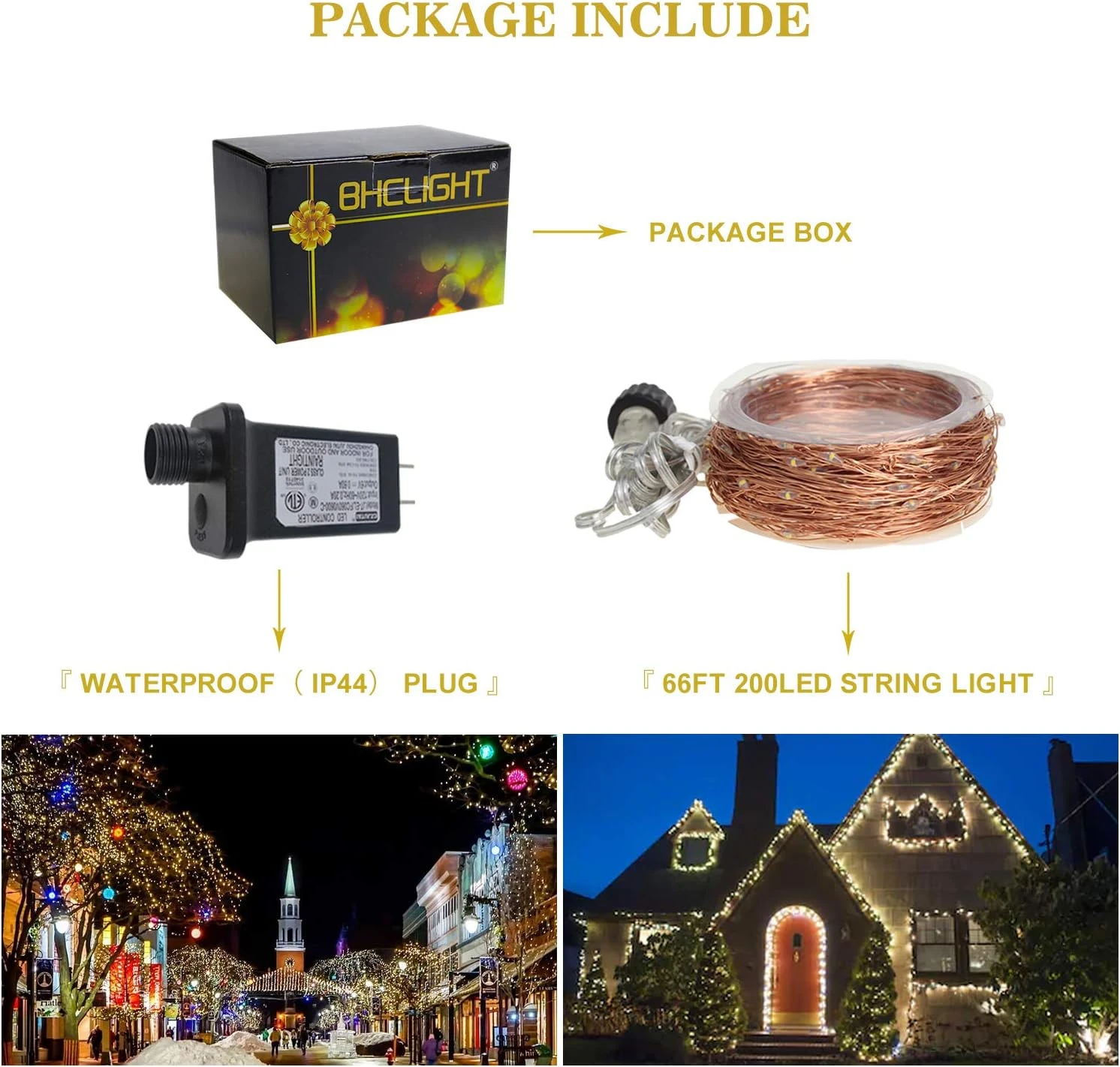 - 【200 LED Fairy Lights】: Upgraded Brightness 200LED 66FT string lights, Warm White, IP44 Waterproof, UL588 Approved, 8 Modes, beautiful twinkle light for bedroom decorative, great ideal for party, wedding, Thanksgiving, Christmas, etc.
