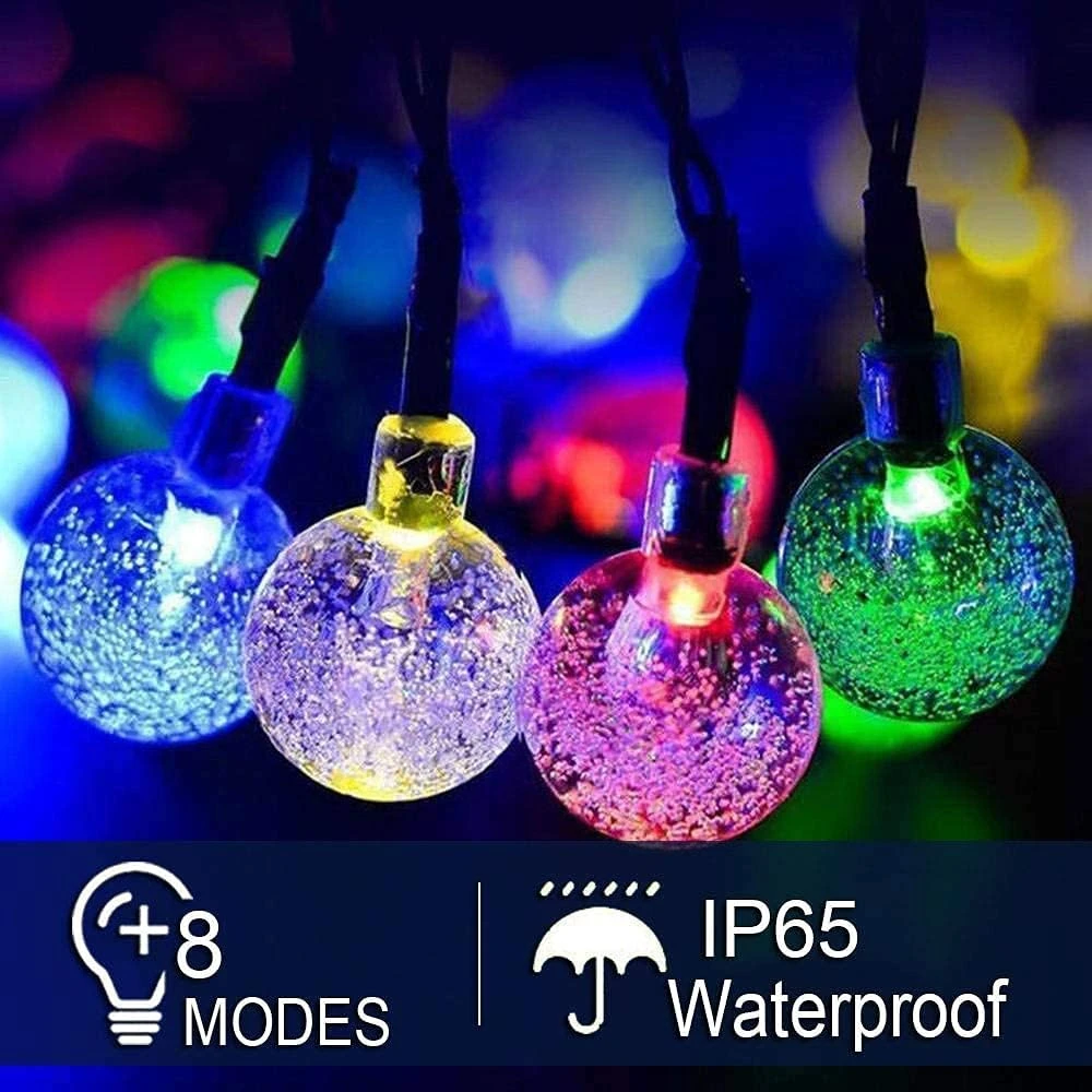 - 【Perfect Home Decorations】: 50 high quality LED crystal ball string lights and 24ft cable, enough length for your to decor your home and garden。 IP65 Waterproof can withstand all kinds of weather, including heavy rain and snow, perfect for indoor and outdoor decorations. Add warm and charming atmosphere to your gardens, patio, lawn, porch, gate, yard, tent etc.