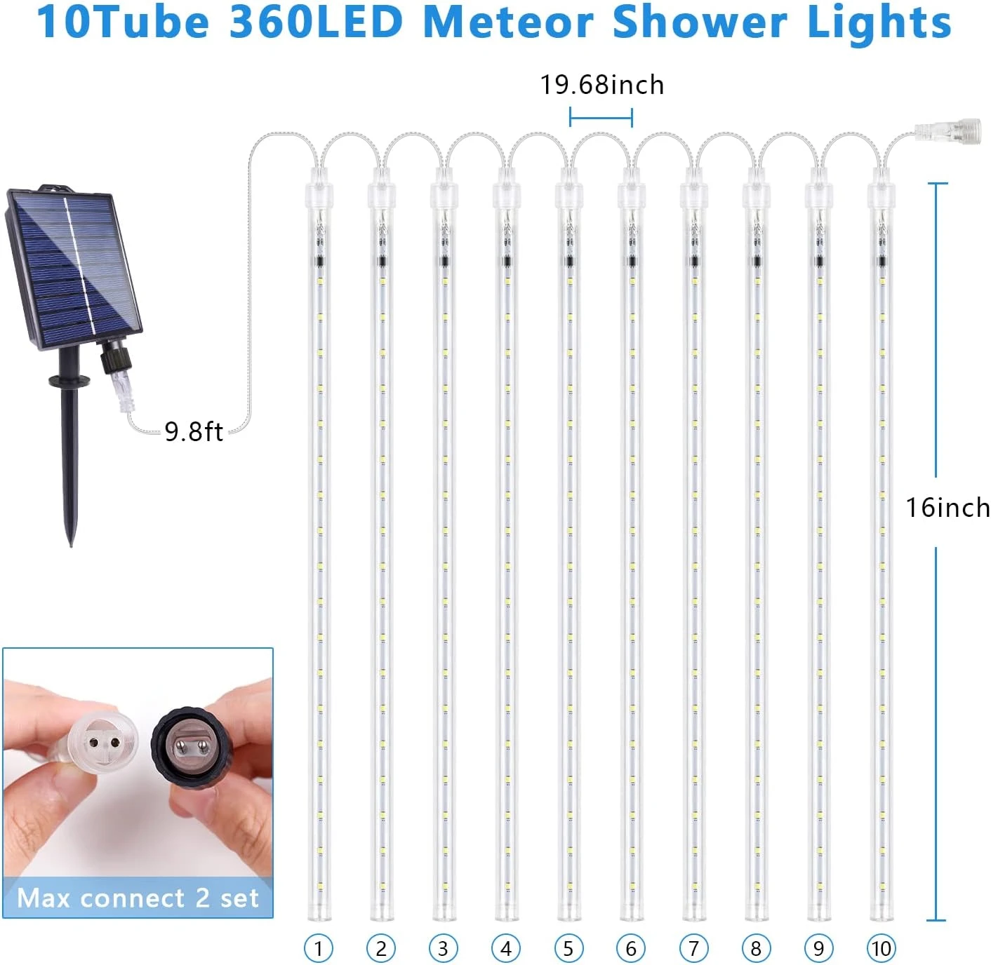 - ❄️Upgraded Length Design❄️ Instead of common 8 tubes 12inch meteor shower lights in the market, ours has 10 tubes in 1 string and each tube is 16inch with 36 LEDs, total 360 LEDs. We also updated the the tube spacing to 19.7inch that it’s more flexible for decoration arrangement. Max 2 strings can be connected together to illuminate a larger area.