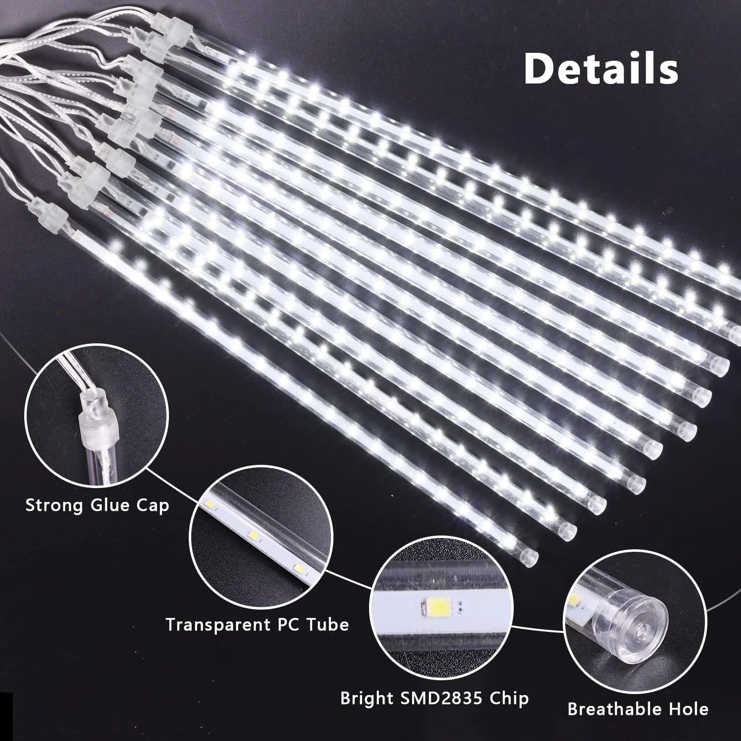 - ❄️High Brightness & Waterproof❄️ Adopts high quality SMD2835 LED chip, our falling rain lights looks bright in 360 degree lighting angle, especial attractive when they drops from the trees in distance. The LEDs are protected well in the tube by the sealed glue cap that the snowfall led lights withstand rainy and snowy weather, perfect for outside decoration.