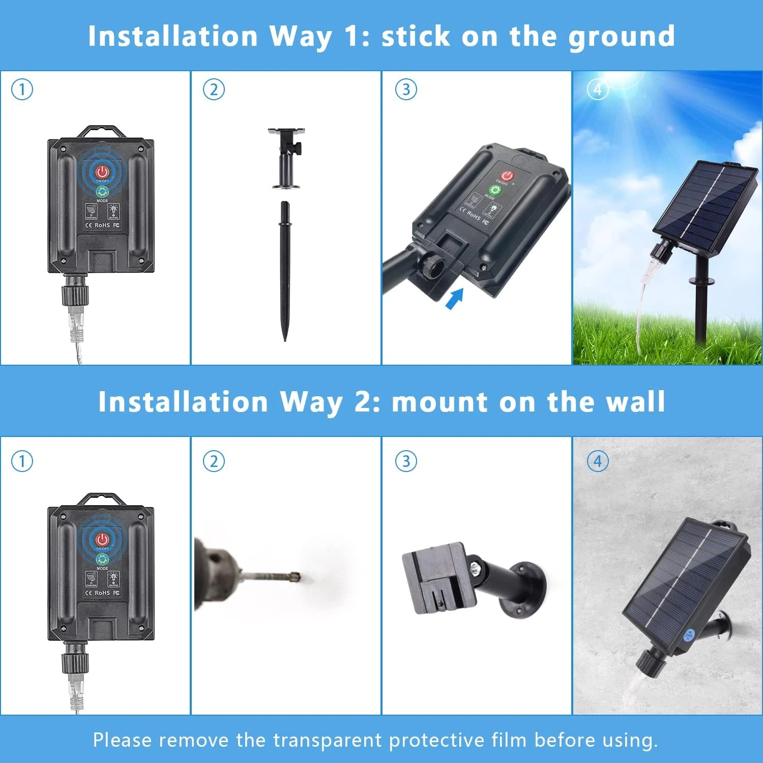 - ❄️Easy to Use❄️ There is 2 way for installation: mount the solar panel on the wall by screws, OR insert in the ground by the stake. After installation, the built-in light sensor will keep the drop rain lights auto on in the dark and off at daytime, no need to operate again. Notes: Please tear off the protective film and press the button “on” before installation.