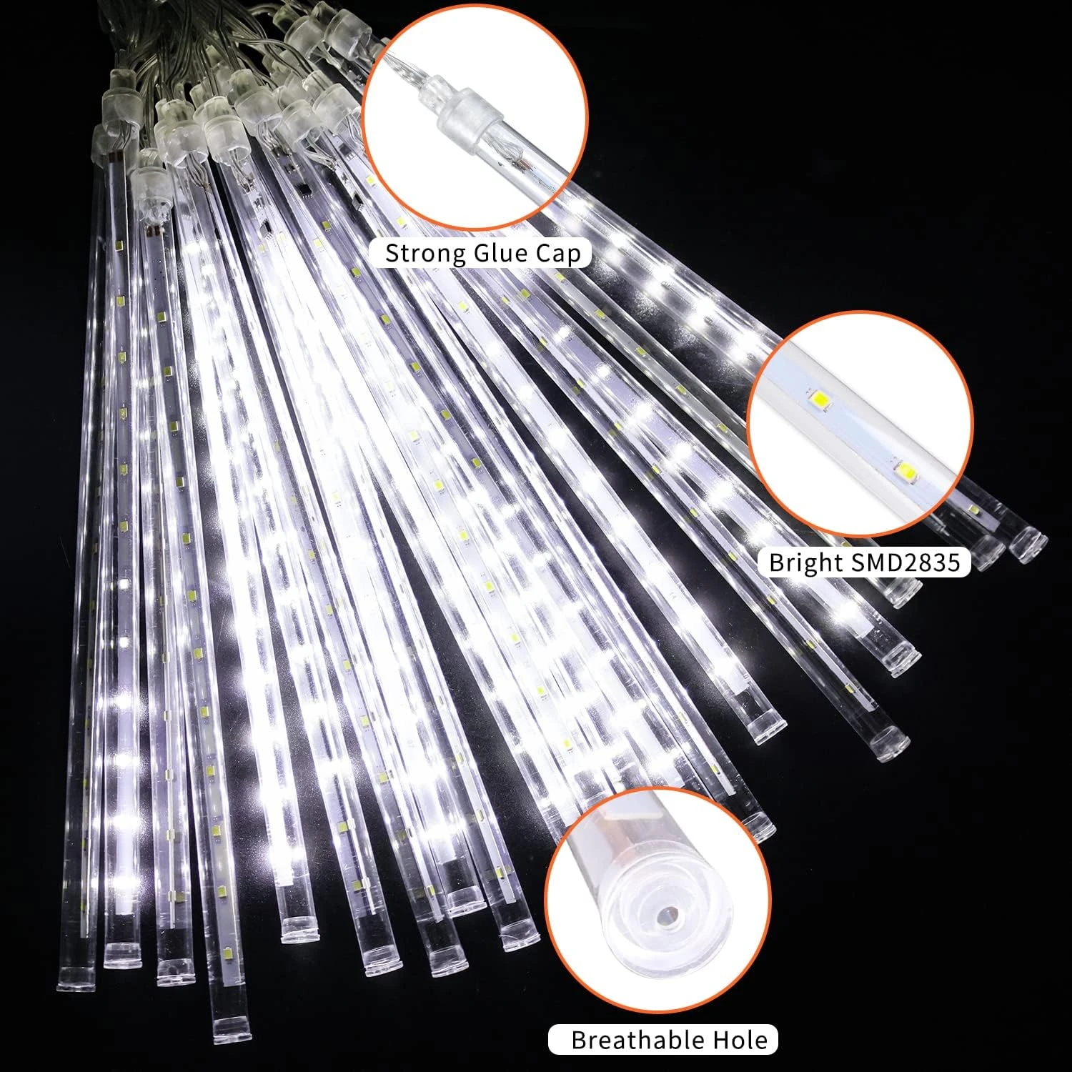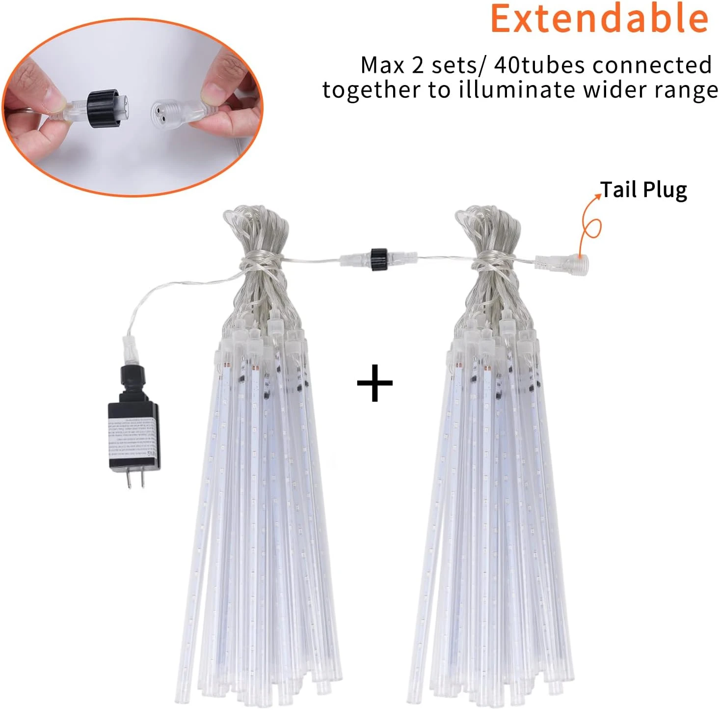 - 【Extendable Length】Our meteor shower lights has 20 tubes in one strand, each tube is 30cm/11.8 inch long. The 50cm/19.7inch tube spacing is longer than market and flexible for arrangement. Each set falling rain lights has end-to-end connector that allows up to 2 strings connected together and powered by one plug conveniently. The lead cord is 3m/9.8ft for plug in from anywhere.