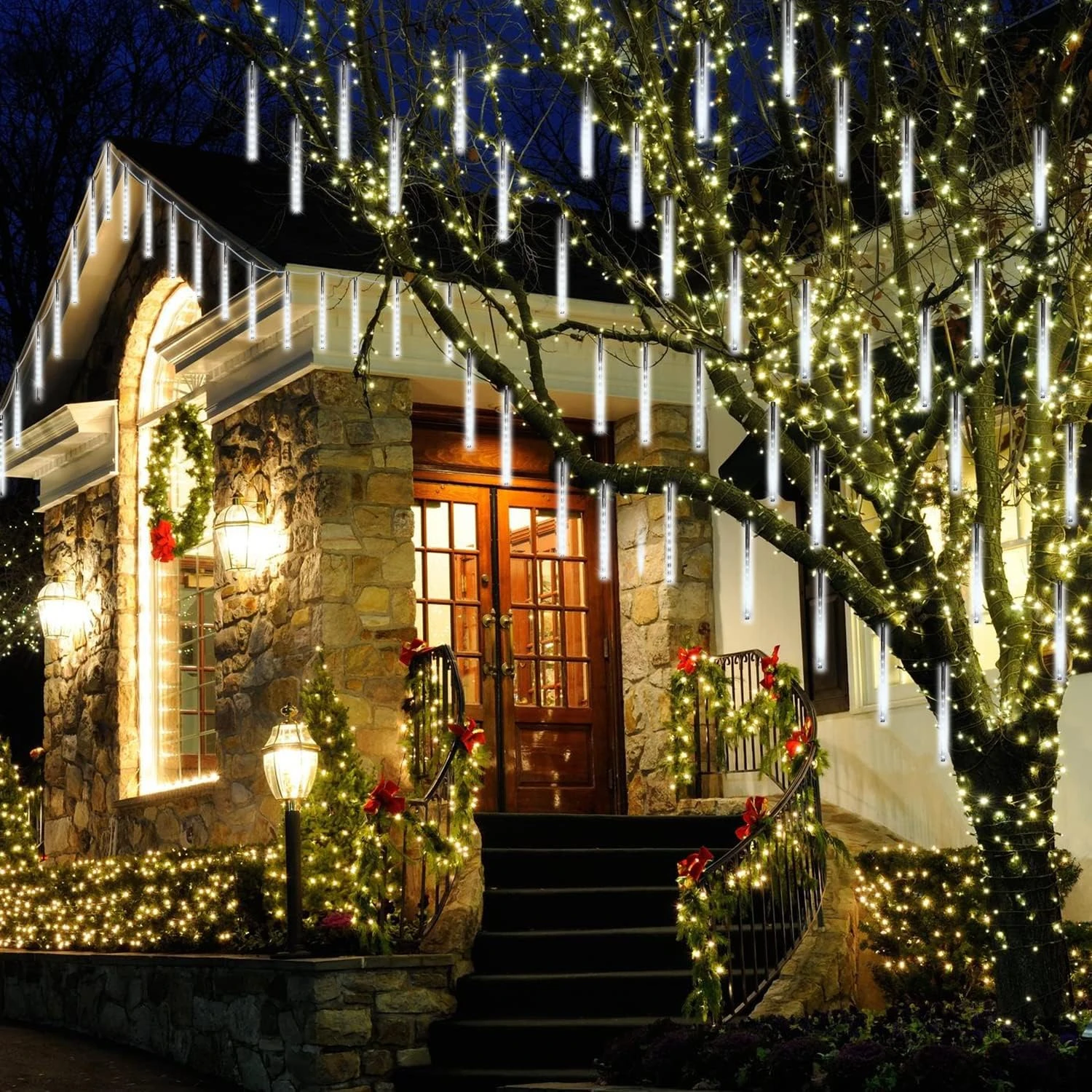- 【Safety with Energy Saving】Equipped with UL certified plug, outdoor Christmas lights is compatible with USA standard outlet. 7V working voltage is much lower than 30V safe body voltage, the meteor shower rain lights will not overheat even long time usage, no worry about electric shock or short circuit. NOTES: the plug is not waterproof, please keep away from water.