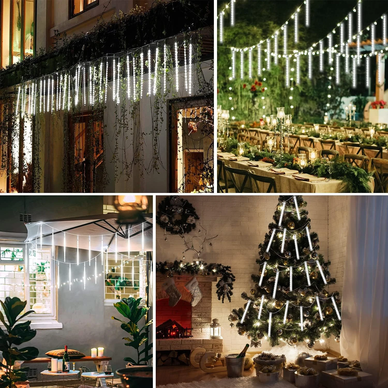 - 【Romantic Shower Meteor】Plug in power, this Christmas lights will drop at same time like a cascade for few seconds, then LED beads begin to turn on and off one by one, and there will be a delay between each tube, so the dripping icicle lights will fall randomly like meteor shower or falling snow across the sky, adding dreamy atmosphere for the lonely night.