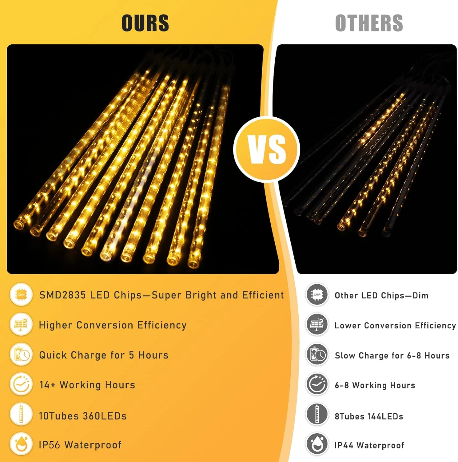 - 🌠EYE-CATCHING EFFECT – Inspired by the magic that meteor can bring happiness and luck, the solar tree lights will bright up sequentially and goes out rapidly through the tube, as beautiful as a meteor shower and falling snow in the night sky. Great for home patio, garden, yard, Christmas tree, umbrella, roof, porch, fence and awning. They are also perfect decorative lights for various occasions like engagement, wedding, birthday, graduation, party, Xmas, Halloween, New Year and other festivals.
