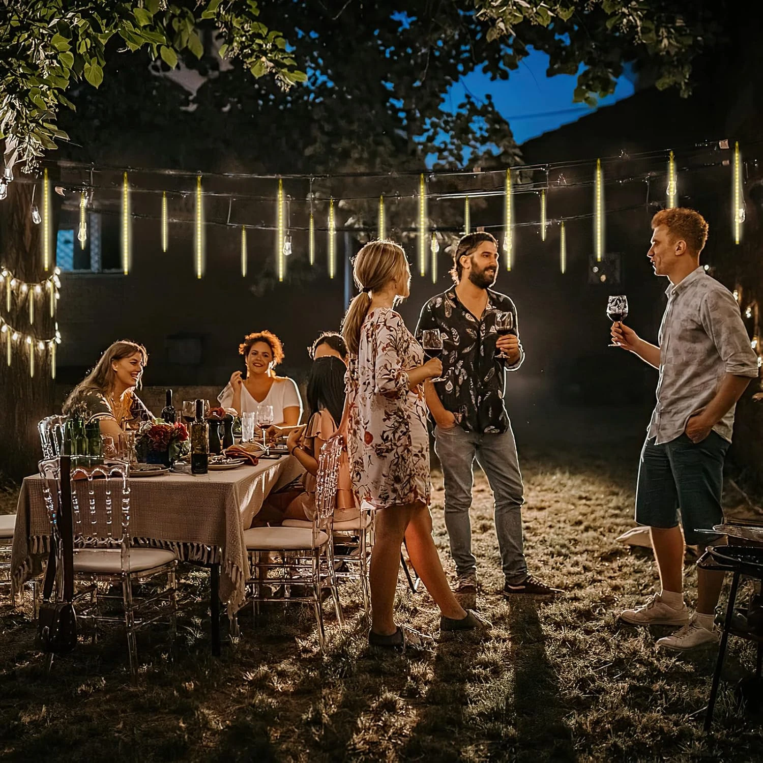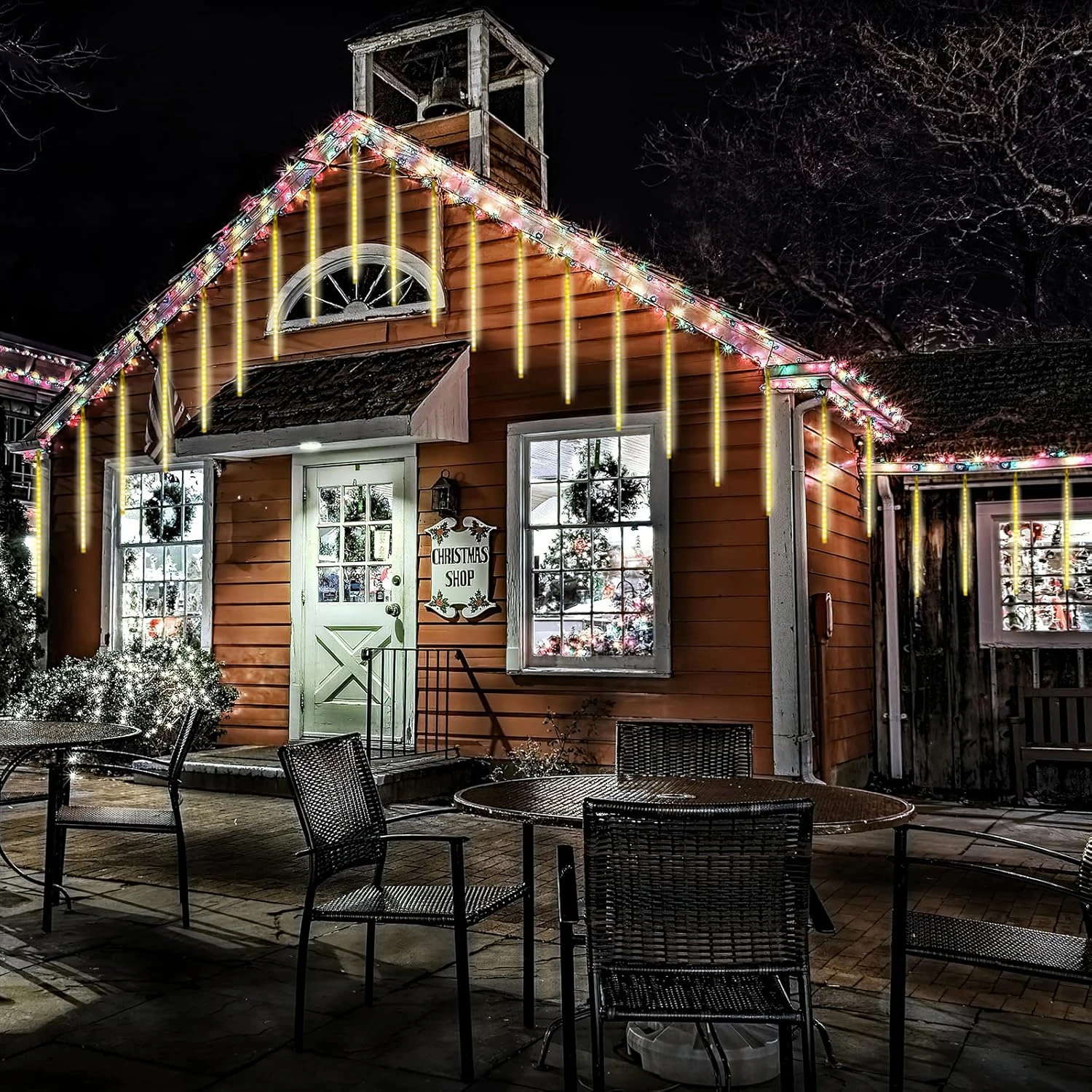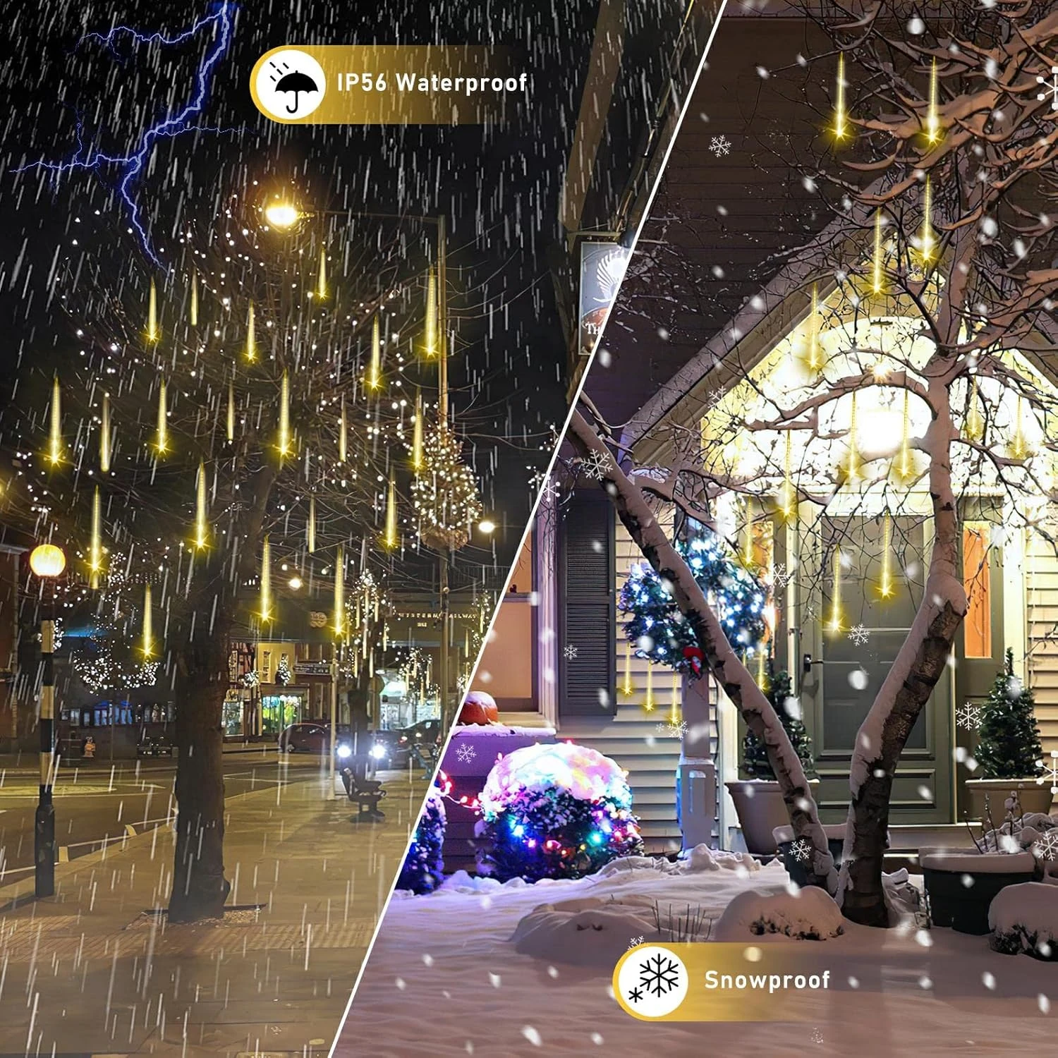 - 🌠UPGRADED DESIGN – The new Christmas lights come with 10 tubes (instead of 8). Each tube is 40.6cm/16″ long and 50cm/20″ apart. Adopting high quality SMD2835 LED chips (instead of cheap dim 3528 LED chips), the rain lights look much brighter and more attractive even from long distance. The lights shine with a 360 degree viewing angle, bright, deep, and not dazzling, adding charm to your festival decorations.