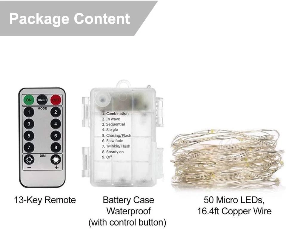 - Remote Controlled: This string lights comes with a remote control that has 13 buttons which include 8 light modes (combination , wave; sequential; slo glo; chasing/flash; slow fade; twinkle/flash; steady )The battery box also one button that can cycle through these different light modes. Other buttons include on, off, timer, and dimming/brightening of the LED’s.