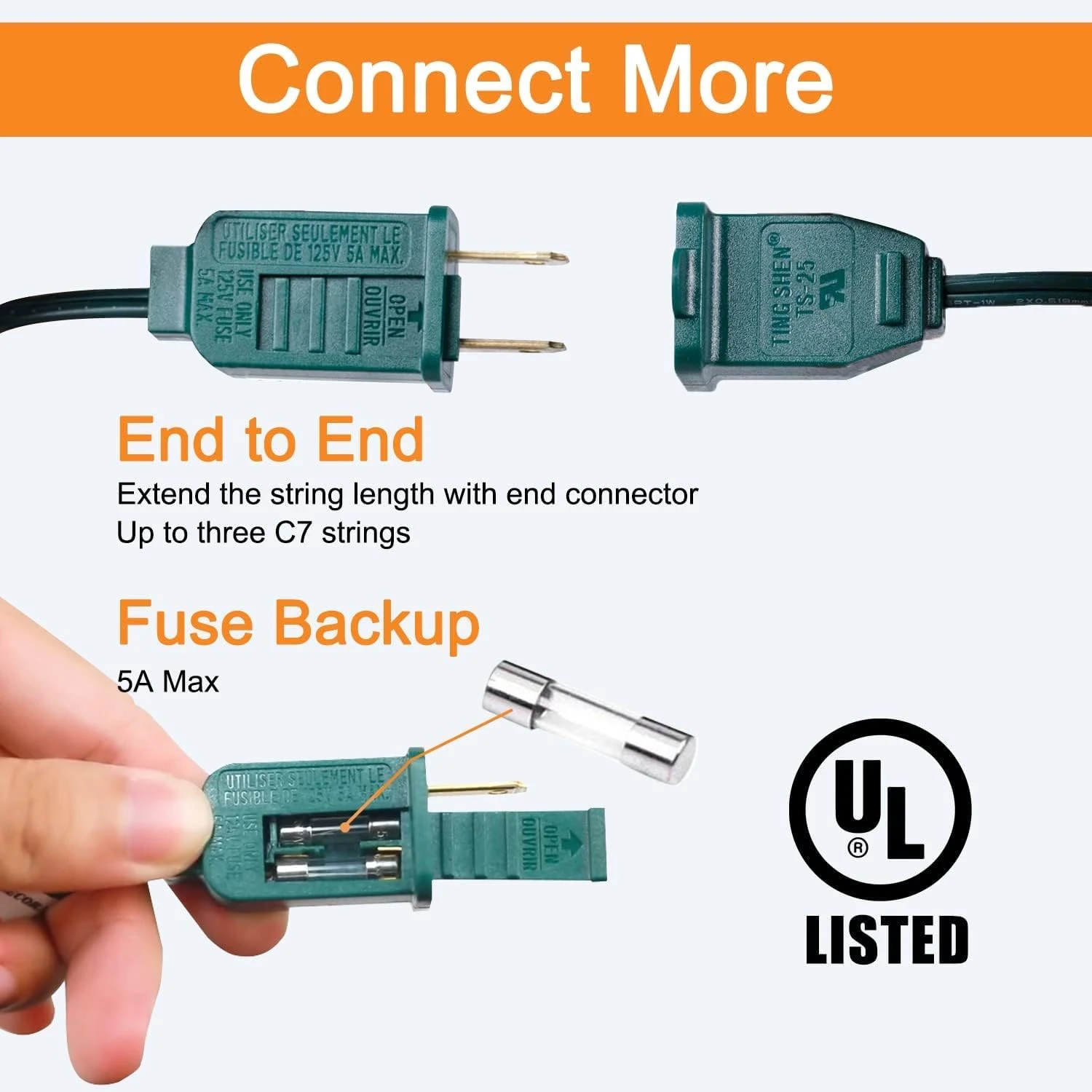 - 🌞【End -to- End Connectable】25FT C7 Ceramic Clear lights with 6″ spacing from male plug to the first bulb, 12″ spacing between bulbs, 6″ tail with female connector. 2 fuses comes in the package for replacement. Each 25FT string light provides end-to-end connections. Connect up to 3 sets End-to-End -75 Feet on one plug. Add the wattage of each lighting string together for total of 375 watts.