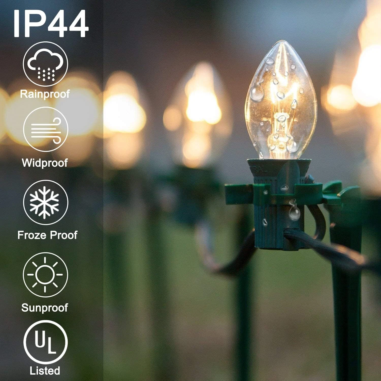 - 🏖️【Safe and Durable】C7 Clear Outdoor & Indoor string light is made of a high quality 20 gauge green wire and a 5 amp fuse ,nickel coated E-12 base bulbs,rating of IP44. UL listed for indoor and outdoor use. One bulb goes out will not affect other lighting. The bulb base designed with a hook,can be passed through with a thin thread for easy hanging, no need to purchase additional hook.