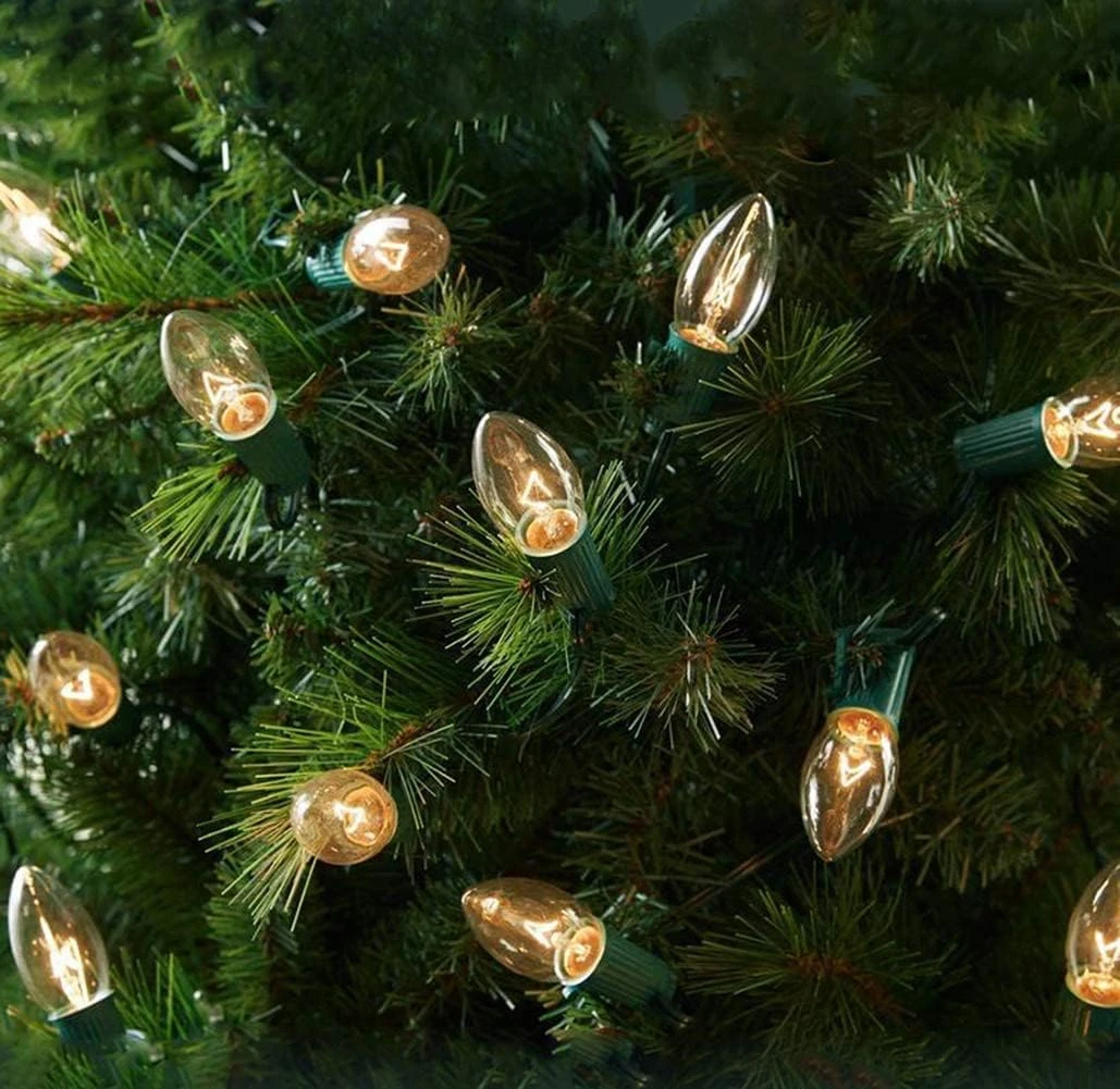 - 💡【C7 Retro String Lights】C7 Christmas lights with 25 Clear-Color C7 Ceramic Green Cord Incandescent light bulbs(plus 2 extra bulbs), total length 25ft per string. 5 watts each bulb,125 watts per string, 120V power. UL Listed for indoor/outdoor use. Every C7 bulb is rated for a 2,500 hour life span and will fit into any C7/E12 socket base.