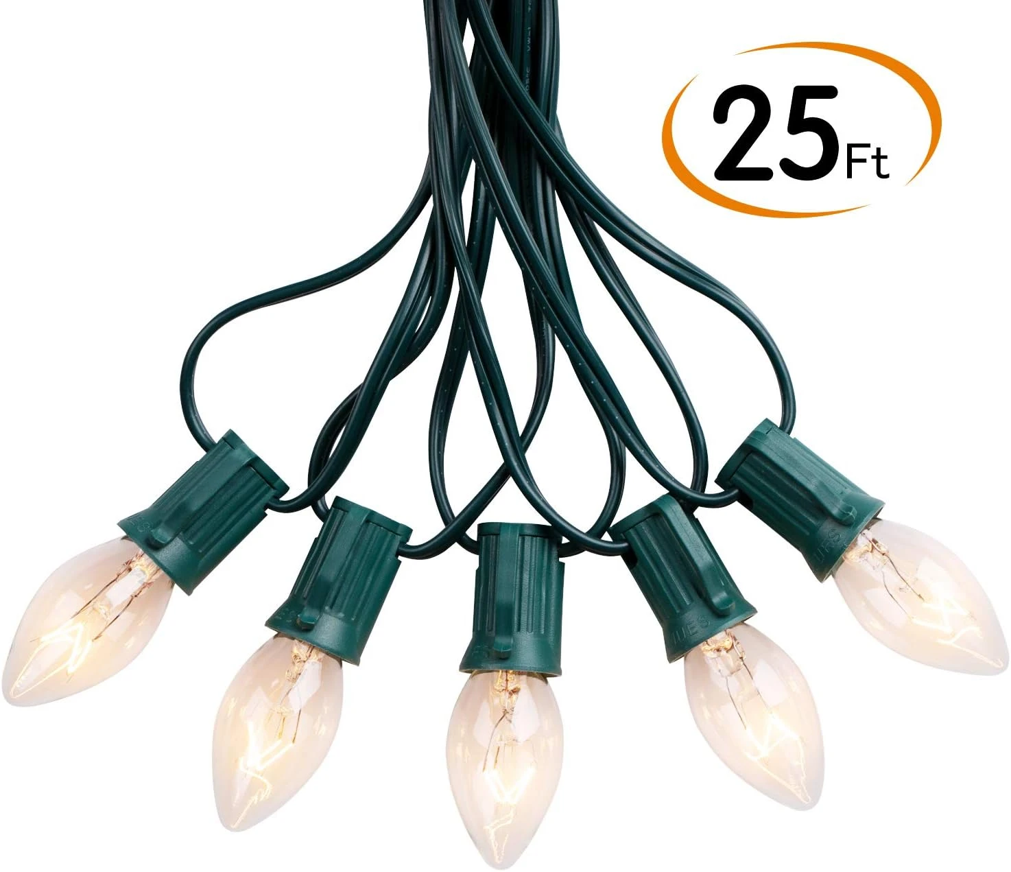 - Christmas string light, 25pc C9 clear warm bulbs, 6″ lead with male plug, 12″ spacing between bulbs, 6″ tail with female connector. Lighted Length 24 Feet, total Length. 25 Feet