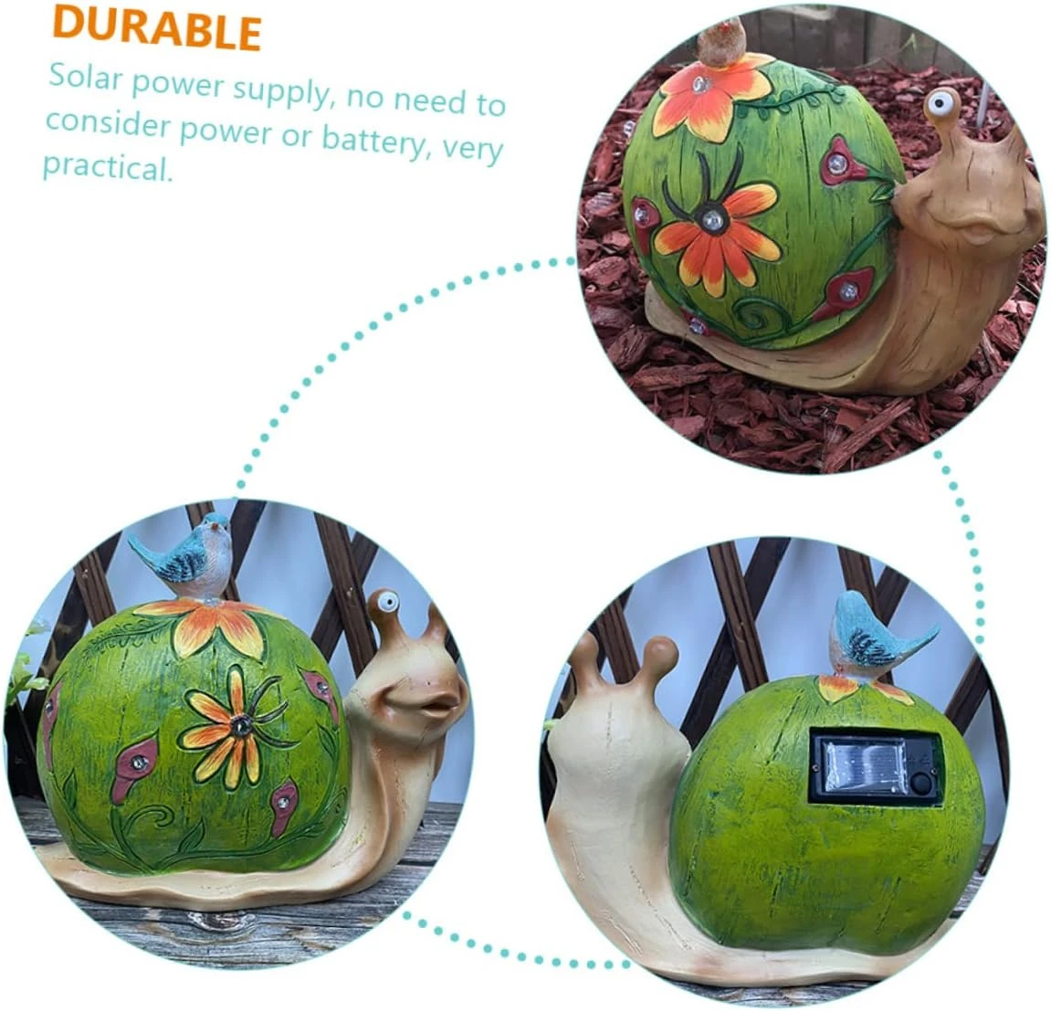 - Solar Snail Garden Decor: Solar Snail Lights Manufactured with resin material, which can serve you for a time.