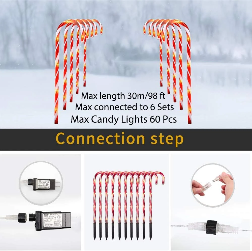 - End to End Expandable Lighted Candy Canes — Female plug at the end is connectable for more than one string, which makes you can connect max 6 sets together. Each one length is 5m/16.5ft, the max expandable length is 50m/98.5ft. Flexible usage in different scences.