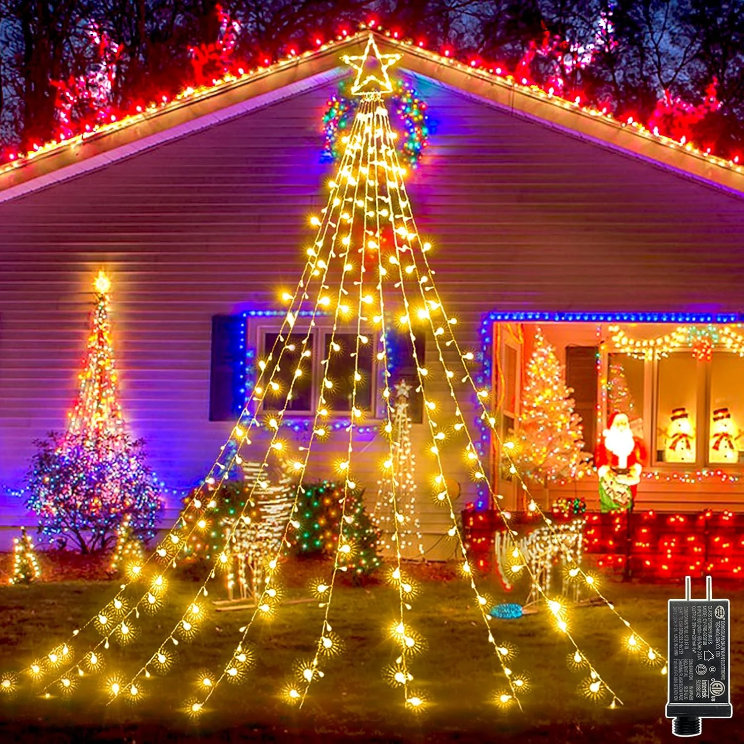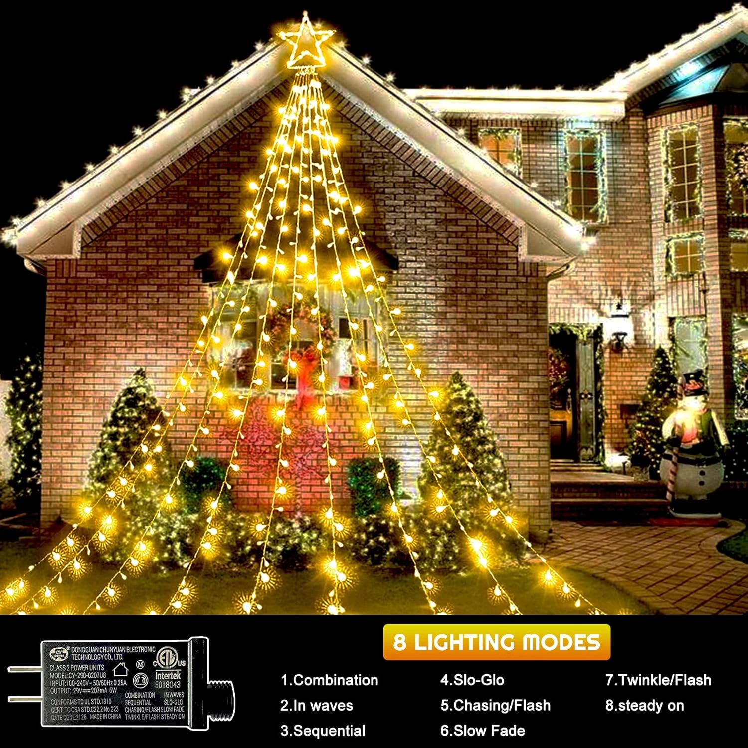 - 【Easy to Installation】When you install these Christmas outdoor string lights, Just hang the big star on an exterior wall, tree or eaves,and the 9 string lights fall to ground.You can make it look like a shooting star or like an outdoor Christmas tree,It looks like a star glittering in the night sky. Provides a beautiful addition to outdoor decorations.