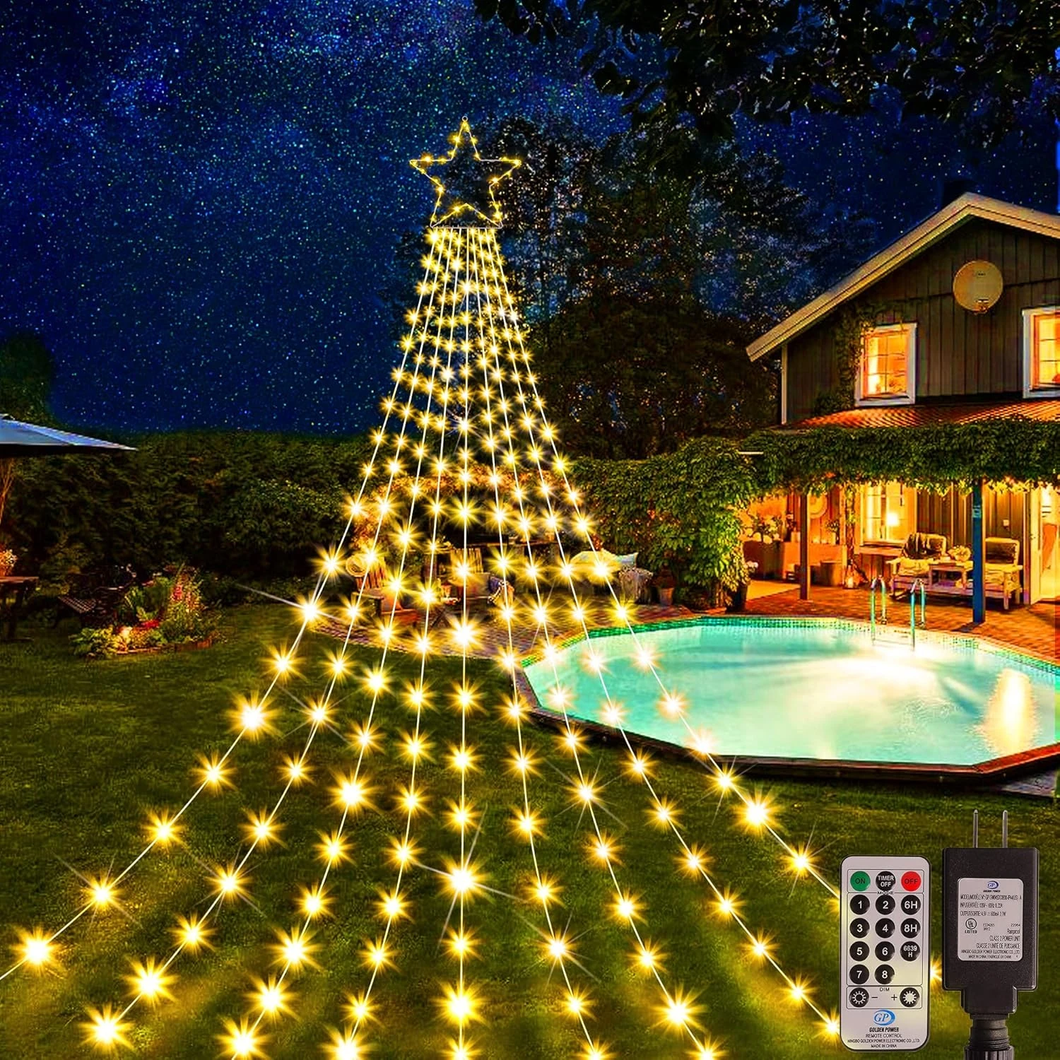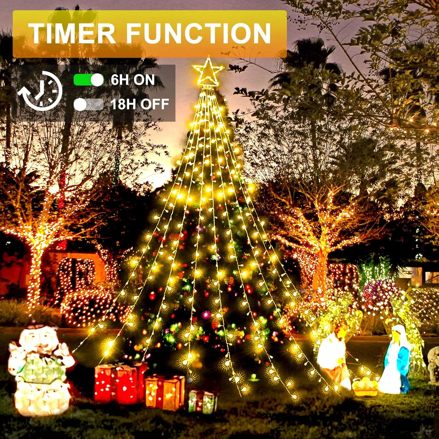 - 【Perfect Christmas Outdoor Decorations】Our Christmas decorations star lights comes with a 12 inch topper star and 9 strings of light which is 11.8 feet each. You can hang the treetop star string light to decorate your yard ,curtain, room, and window.The beautiful Christmas tree lighting creates a better festive atmosphere and is the best choice for indoor and outdoor Christmas decorations.